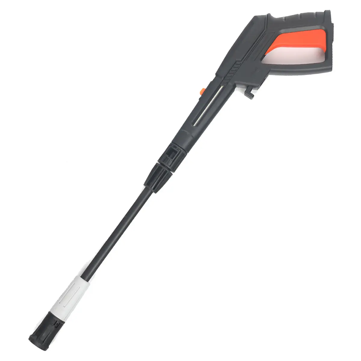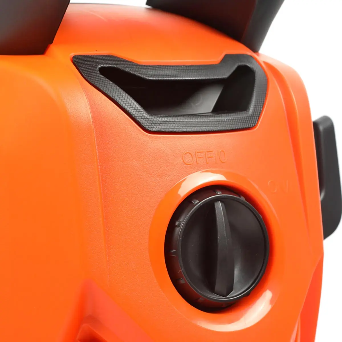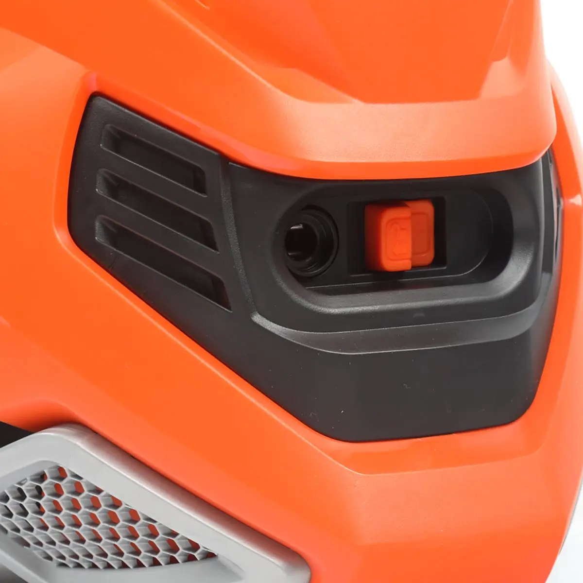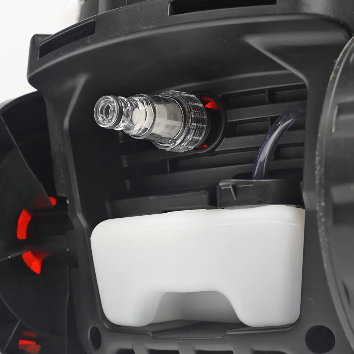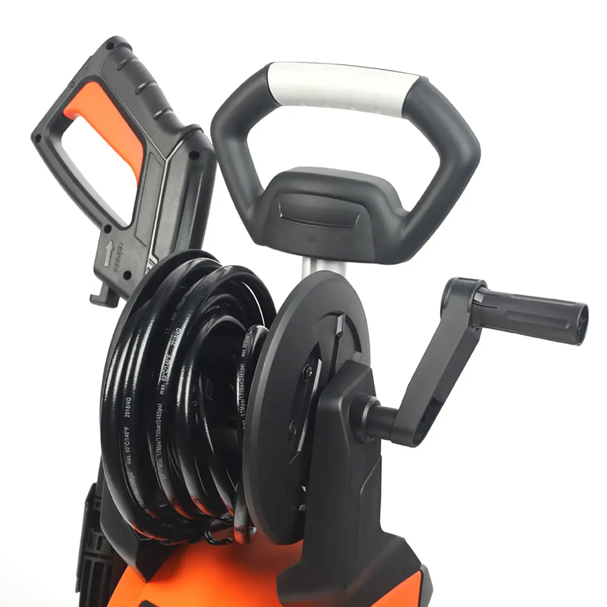 Корпус выполнен из износостойкого пластика. На нем располагается бокс для крепления аксессуаров, а также крюк для кабеля и барабан для сматывания шланга.