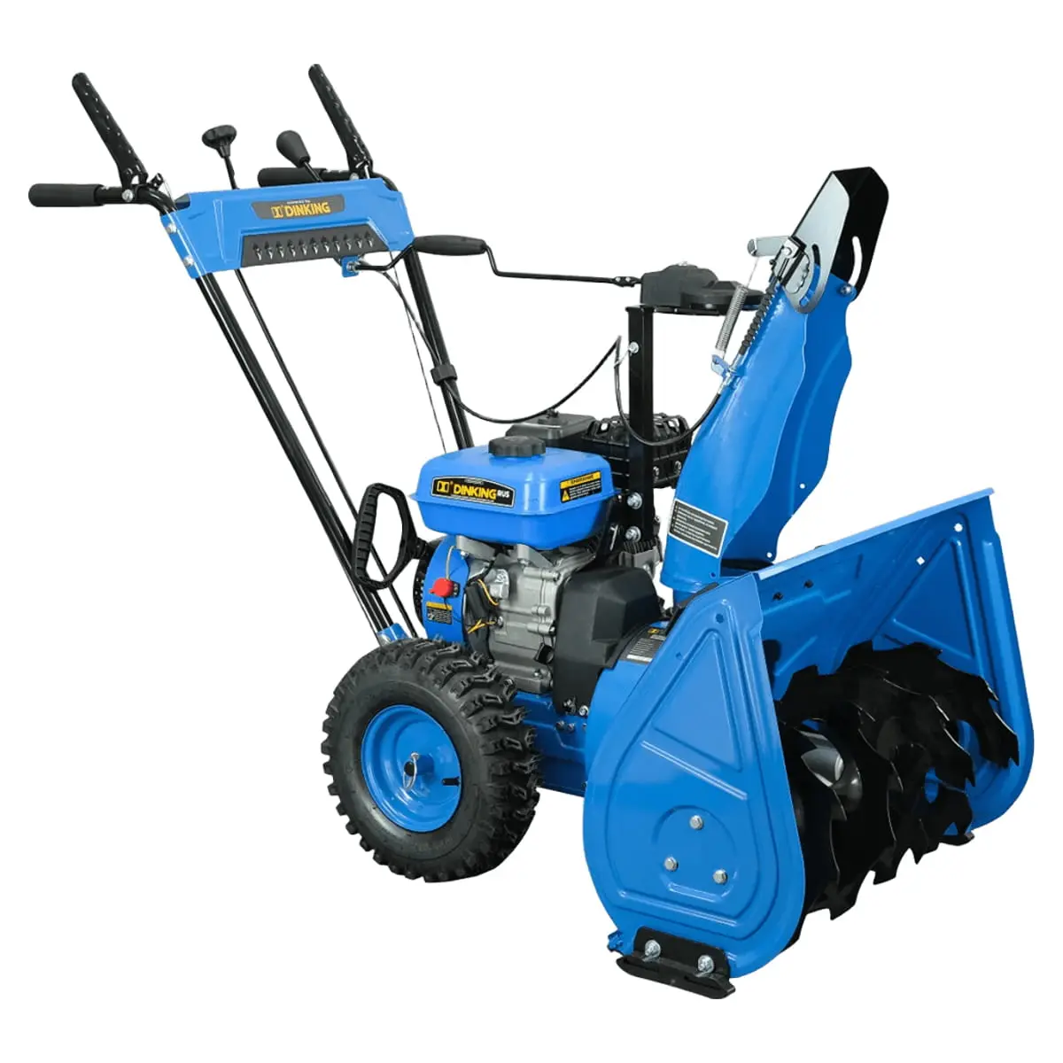 Снегоуборщик Dinking LD624 выделяется самой большой шириной захвата в своем классе — 62 см, что существенно сокращает время уборки за счет уменьшения количества проходов. Высота ковша 51 см позволяет машине "проглатывать" даже глубокие свежие заносы. Двухступенчатая система с мощным стальным шнеком перемалывает снег в мелкую фракцию, после чего крыльчатка выбрасывает его через металлический желоб на расстояние до 12 метров. Регулировка направления и угла выброса осуществляется оперативно и не требует использования дополнительных инструментов.