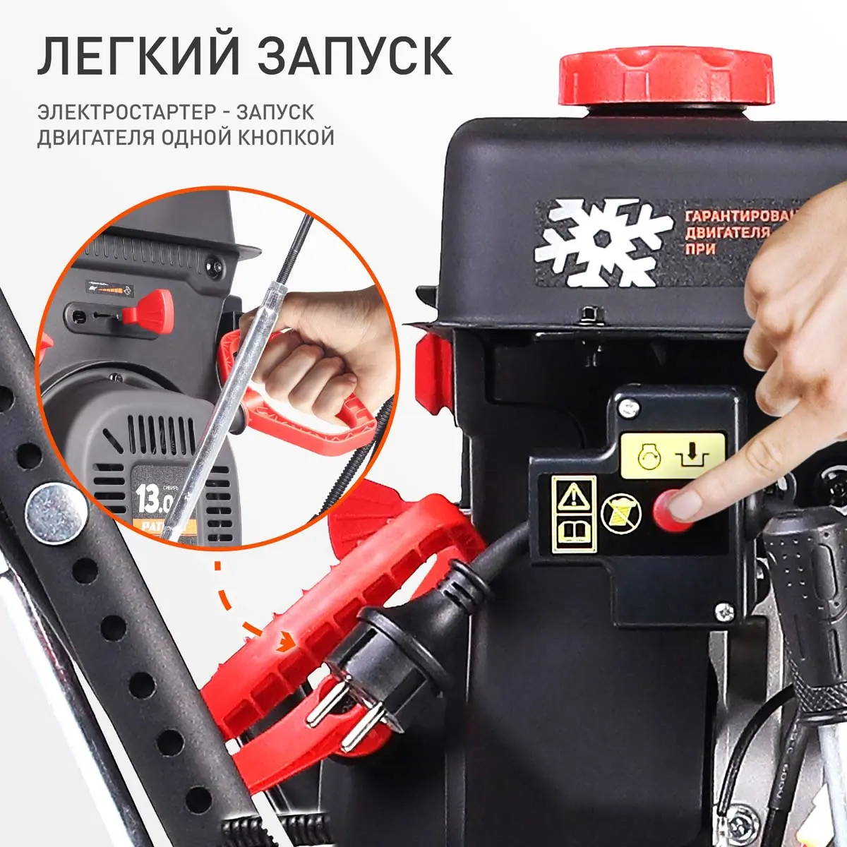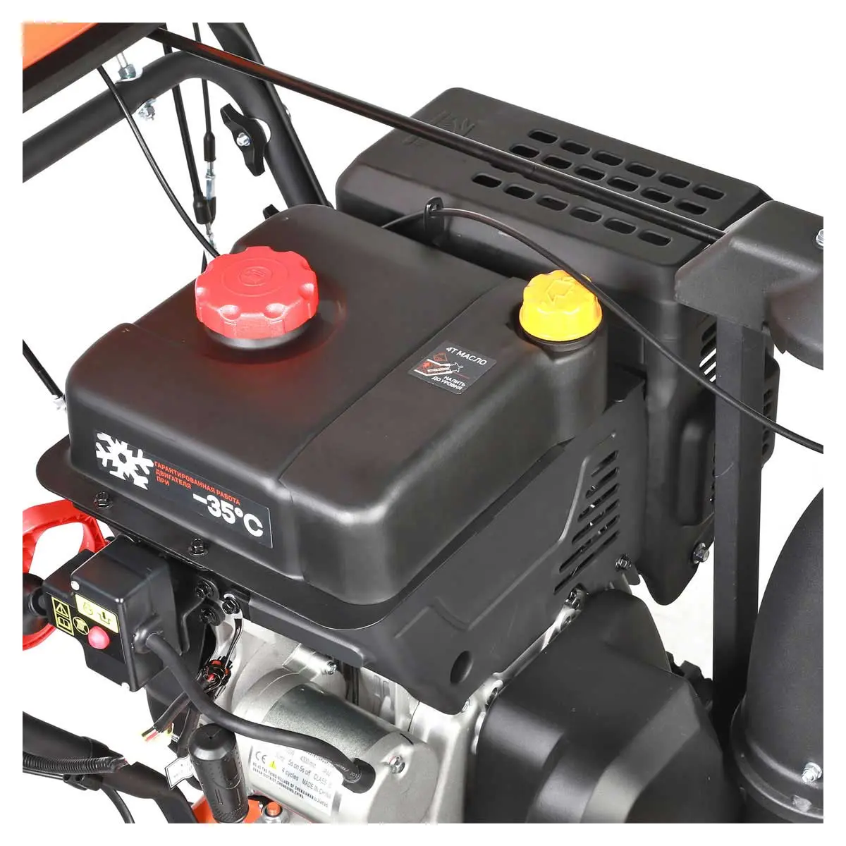 Снегоочиститель может убирать сугробы высотой до 53 см, что позволяет быстро очистить участок даже после сильных снегопадов. Для обеспечения стабильной работы в морозные дни агрегат оснащен специальным зимним двигателем, рассчитанным на температуру до -35 °C. Запуск двигателя не требует особых усилий - для этого предусмотрен электростартер.