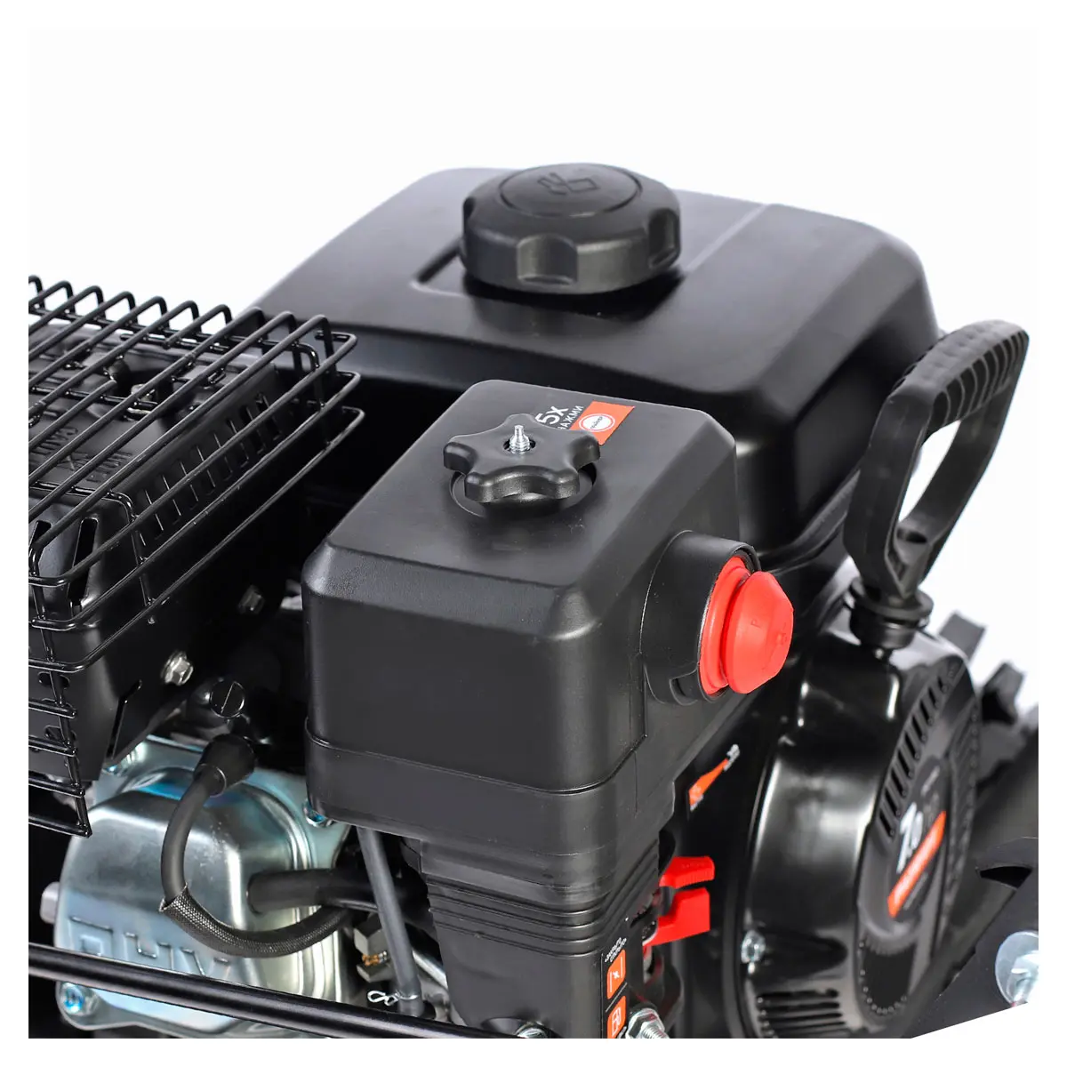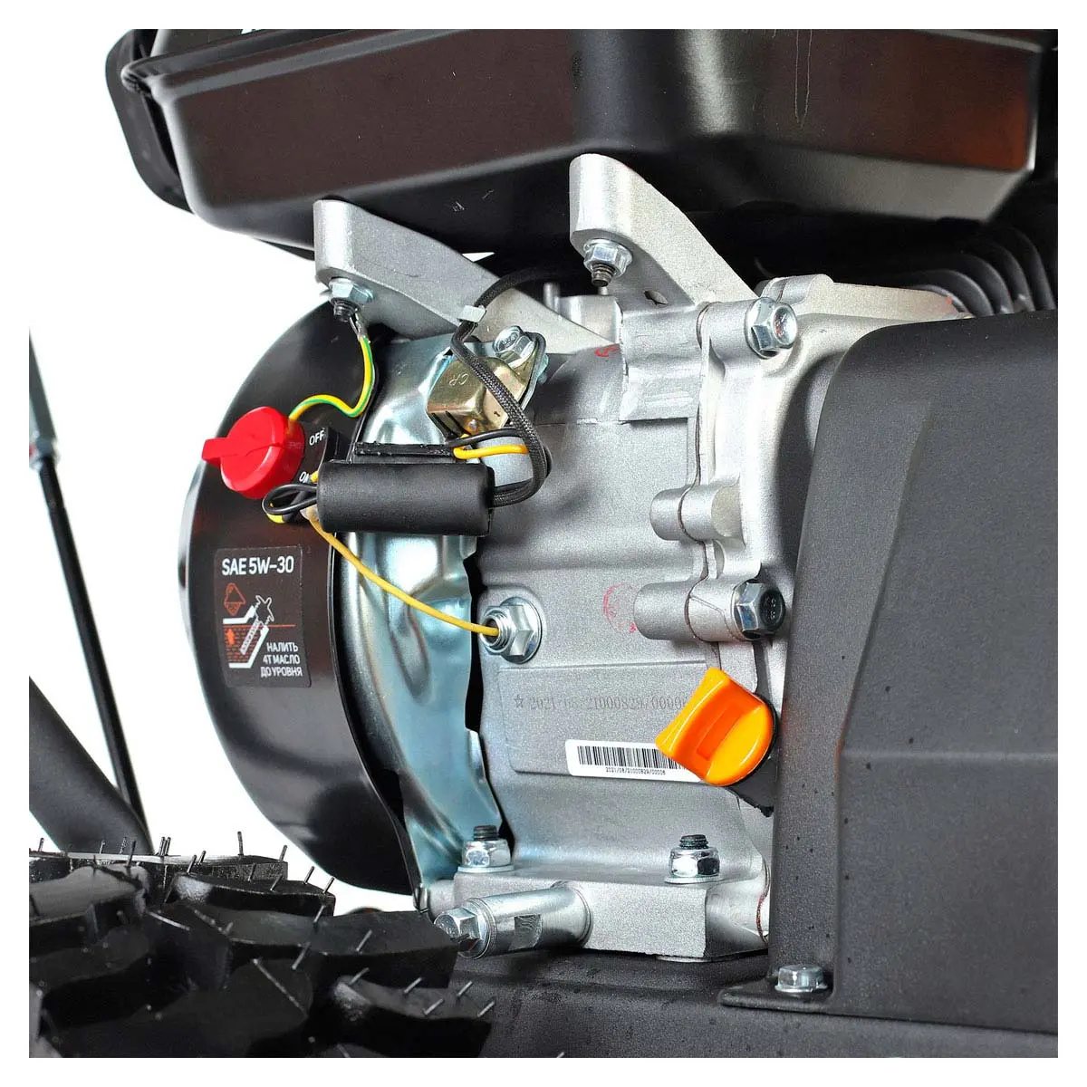 Снегоотбрасыватель оснащен топливным баком емкостью 3,6 л с широкой горловиной, что облегчает заправку. Для стабильной и длительной работы рекомендуется использовать бензин АИ-92. Ручной стартер и праймер для подкачки горючего в карбюратор облегчают запуск холодного двигателя. Металлическая решетка на выходе предотвращает выброс твердых предметов, защищая вас от возможных повреждений.