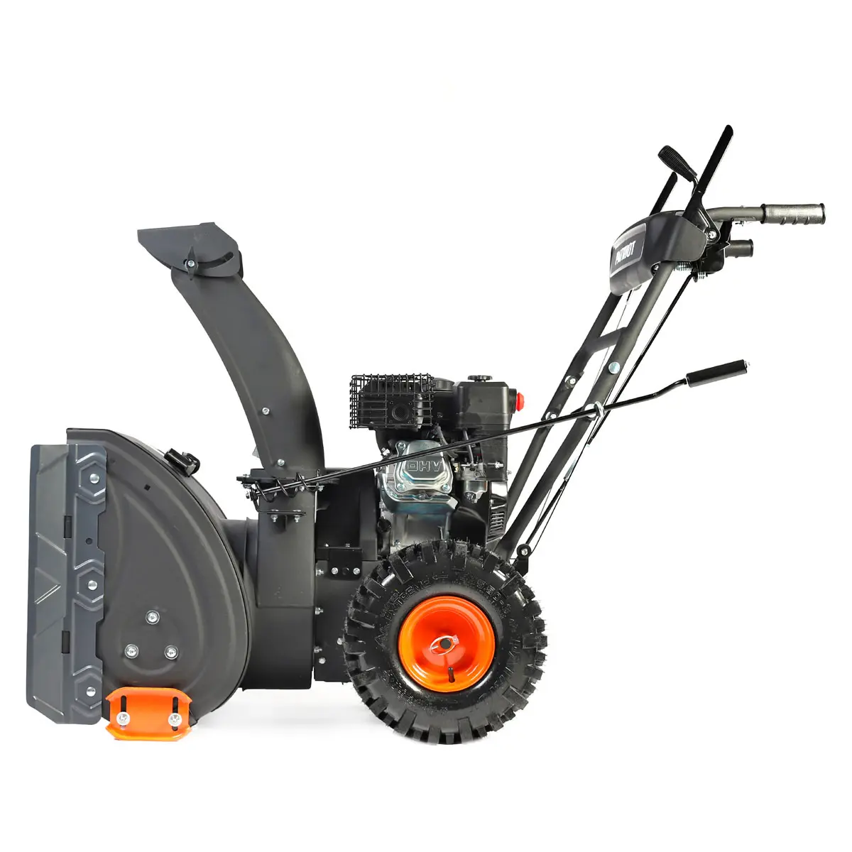 Бензиновый снегоуборщик оснащен 4-тактным бензиновым мотором OHV объемом 212 см³, специально разработанным для эксплуатации в условиях низких температур. Двухступенчатая система с металлическим шнеком позволяет легко перемалывать даже замерзший снег и отбрасывать его на расстояние до 15 метров. Выходной желоб может поворачиваться на 190° с помощью удобной рукоятки, а наклон дефлектора может быть настроен в пределах до 70°, обеспечивая точность и контроль при выбросе снежной массы.