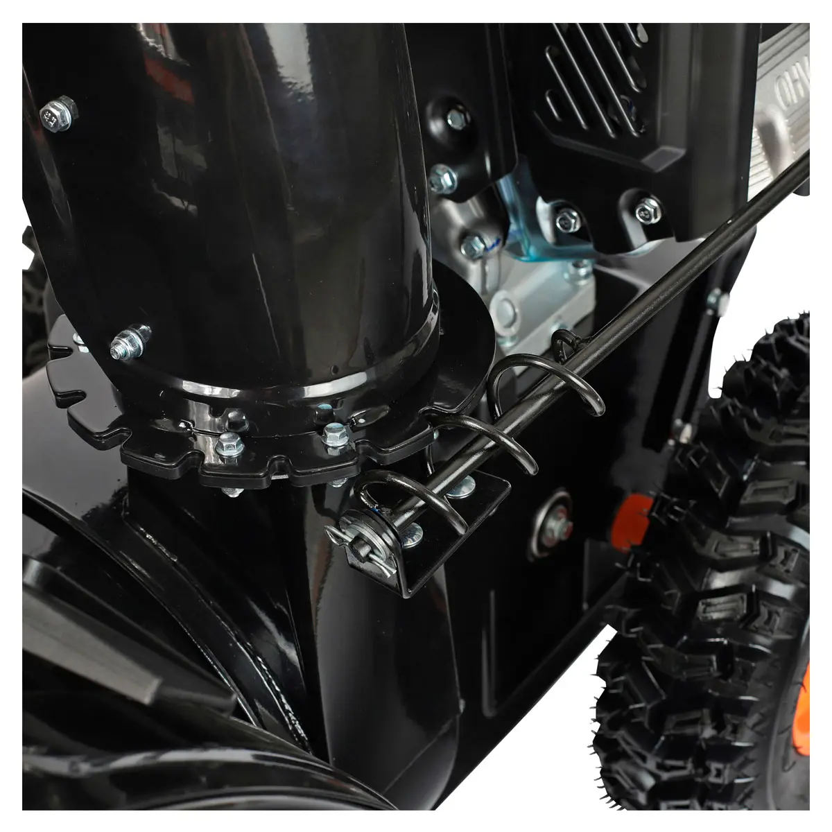 Металлический желоб выброса в снегоуборщике Patriot PRO 750 может поворачиваться на 190° вокруг своей оси, а угол наклона дефлектора можно регулировать до 70°. Это позволяет точно настроить дальность и направление выброса снега на ваш выбор.
