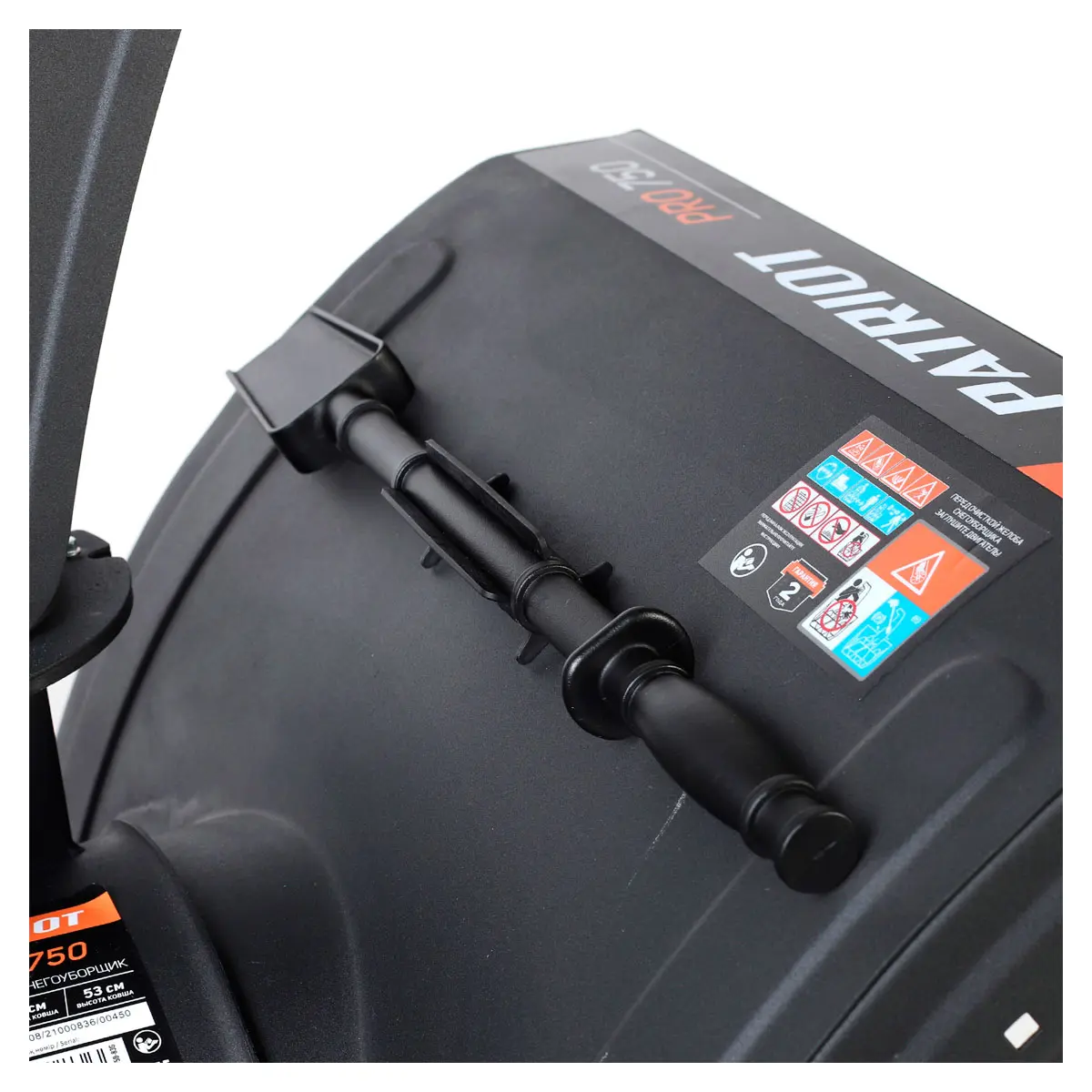 Ширина захвата снегоуборщик Patriot PRO 750 составляет 56 см, а ковш изготовлен из прочного металла толщиной 3 мм. Вы можете регулировать высоту подъема ковша с помощью опорных лап, что особенно полезно при очистке неровных поверхностей, таких как плитка или гравийные дорожки.