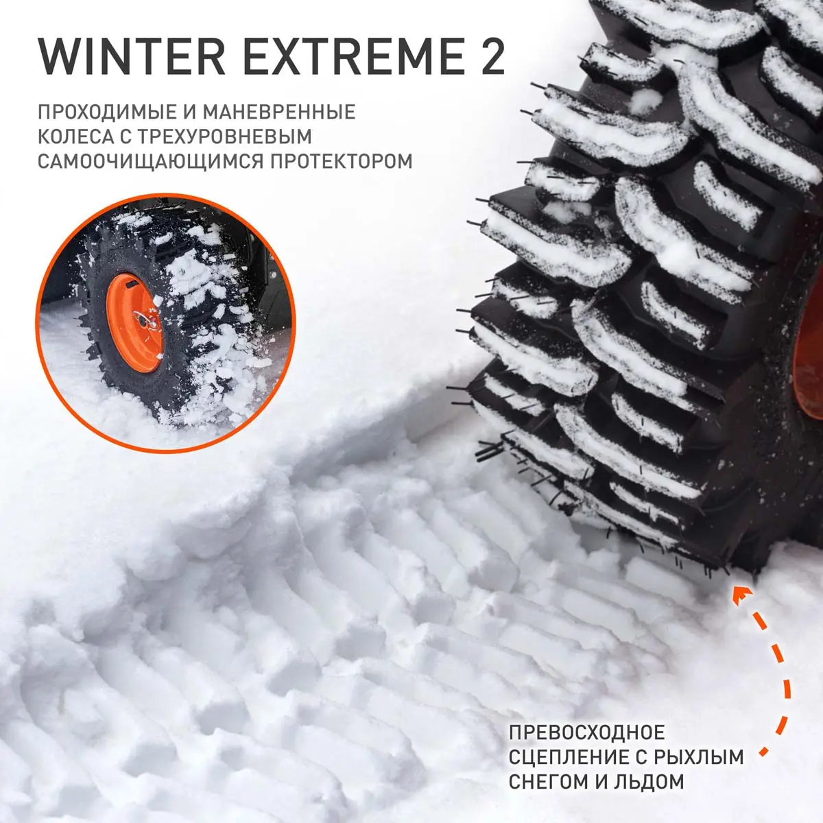 Для высокой проходимости и маневренности в зимних условиях, снегоочиститель оснащен колесами Winter Extreme с гусеничным протектором. Они обеспечивают отличное сцепление с поверхностью и уверенное движение даже по заснеженным и скользким дорогам.