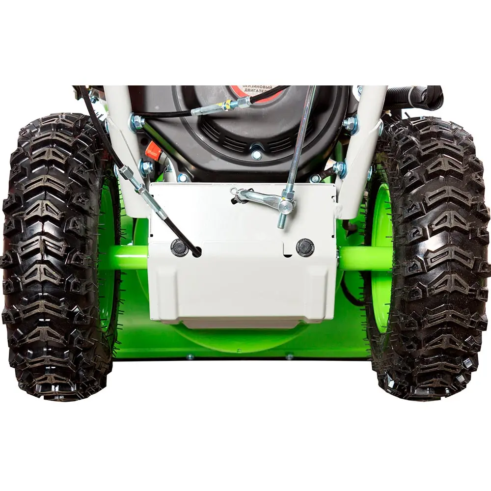 Самоходный привод обеспечивает комфортную работу, позволяя оператору сосредоточиться на уборке снега. Снегоочиститель оснащен большими колесами с глубоким протектором, которые упрощают перемещение и предотвращают пробуксовку на обледенелых участках. Широкие 13-дюймовые шины обеспечивают устойчивость и маневренность агрегата.