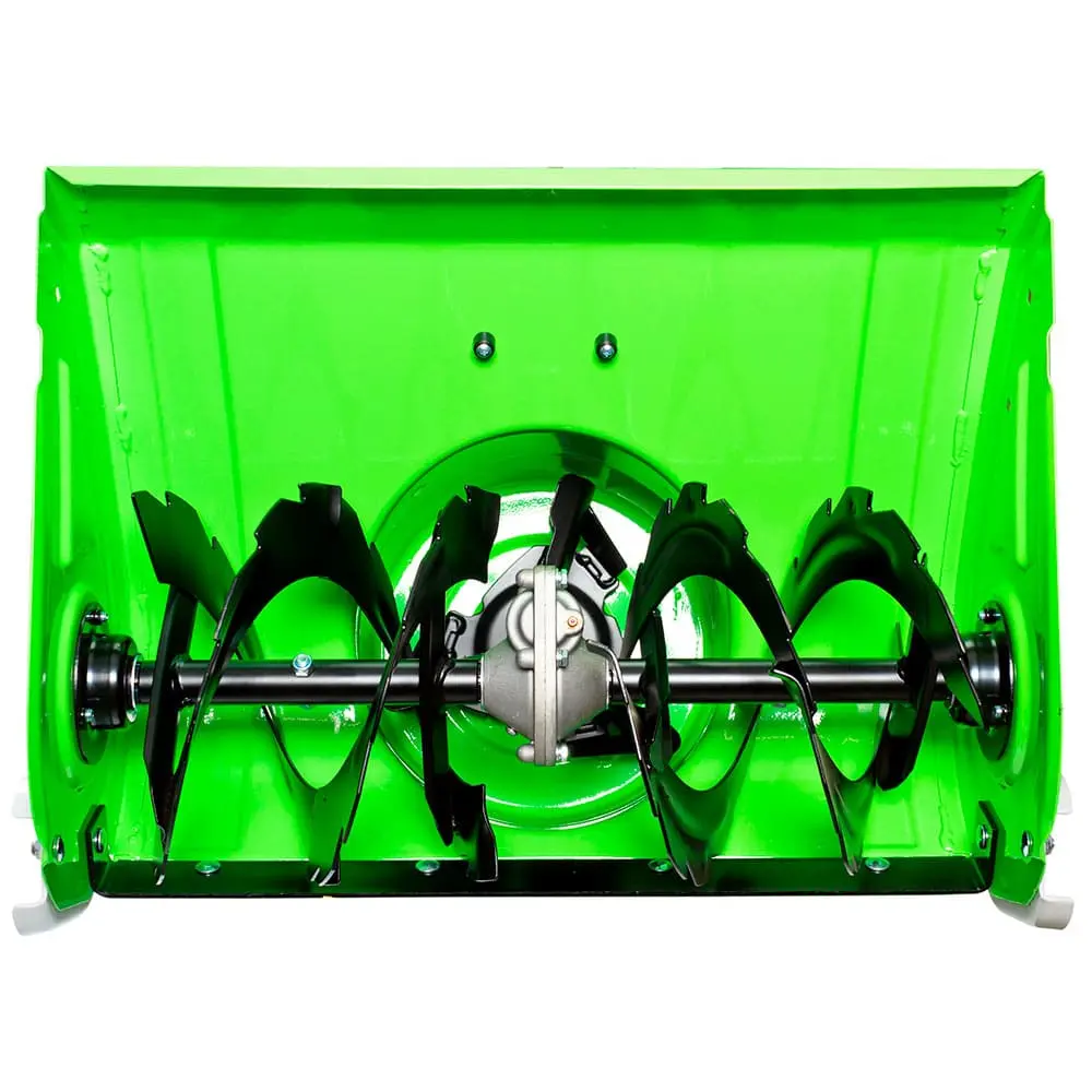Одной из самых впечатляющих особенностей агрегата является его двухступенчатая система выброса снега. Первая ступень — шнек, который захватывает и измельчает снег, а вторая ступень — крыльчатка (ротор), которая выбрасывает снег в желоб. Эта система обеспечивает более эффективный и равномерный выброс снега по сравнению с одноступенчатыми моделями.