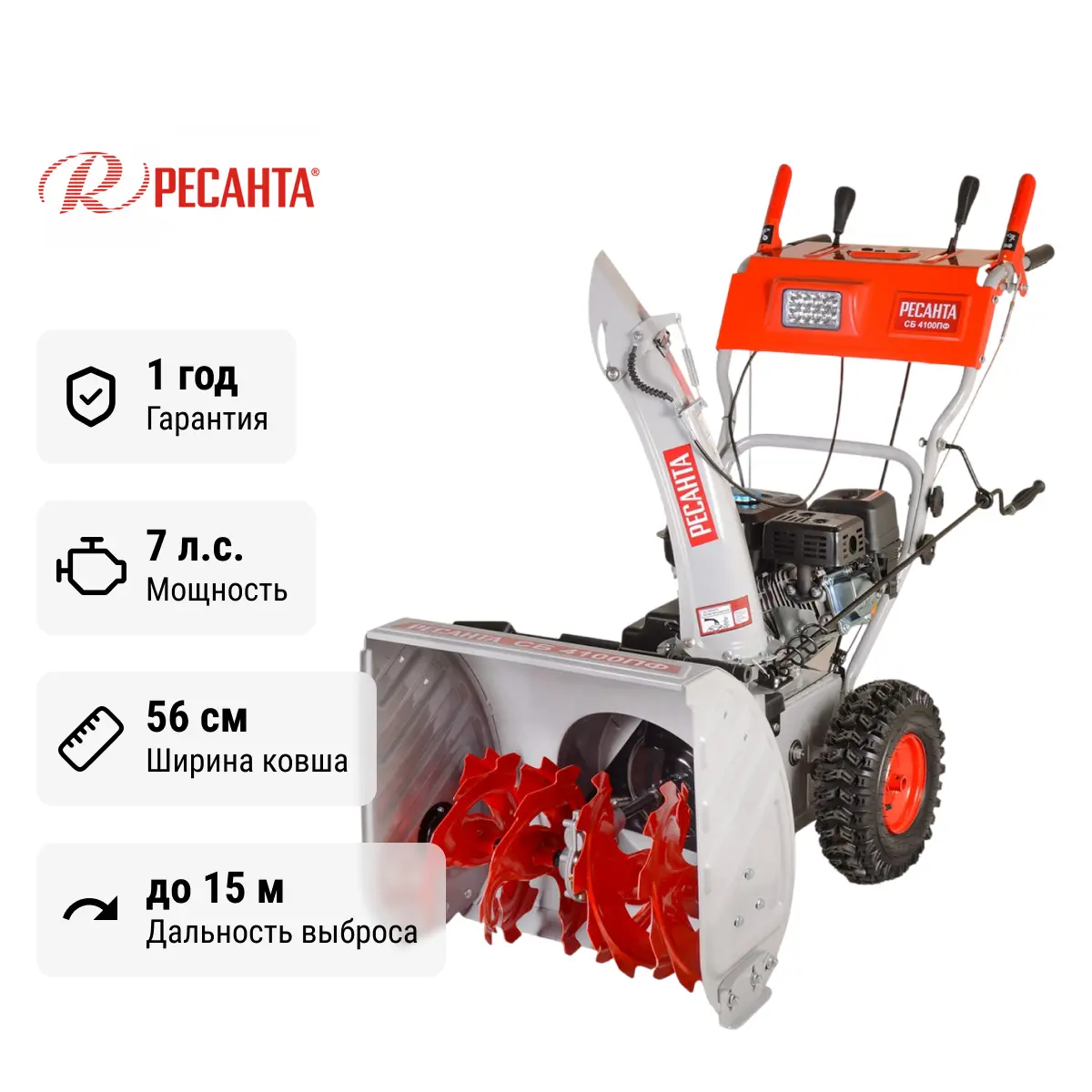 Одной из ключевых особенностей Ресанта СБ 4100ПФ является ширина захвата. За одно прохождение он способен очистить полосу шириной 56 см, что значительно ускоряет процесс уборки. Высота захвата также увеличена до 54 см, что позволяет справиться с даже самыми глубокими снежными накоплениями.