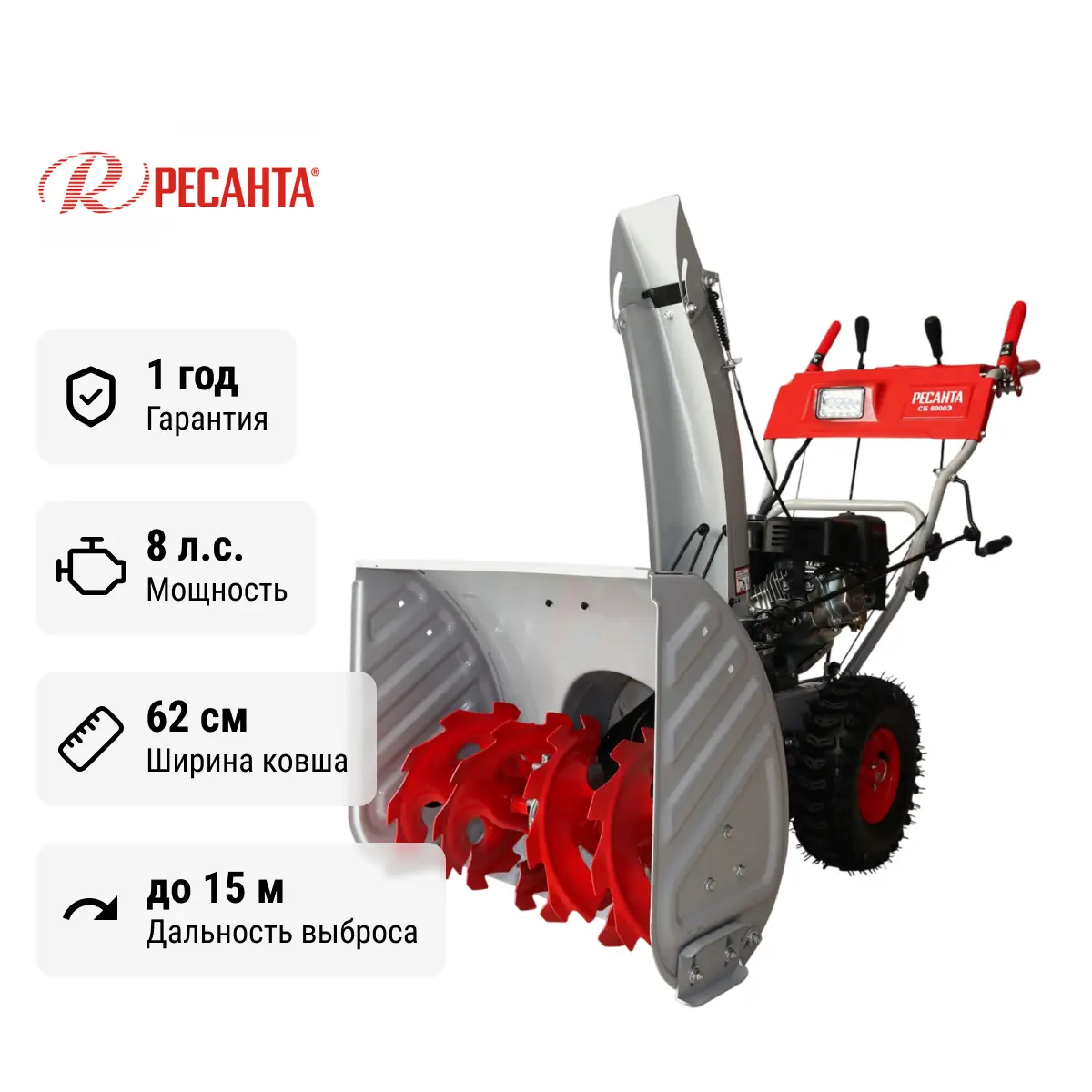 Одной из главных особенностей модели Ресанта СБ 6000Э является впечатляющая ширина обработки за один проход — 62 см. Это означает, что вы сможете очистить большую площадь за кратчайшее время. Кроме того, высота захвата составляет 54 см, что позволяет справиться с различными типами снега, включая мокрый снег и ледяную корку.