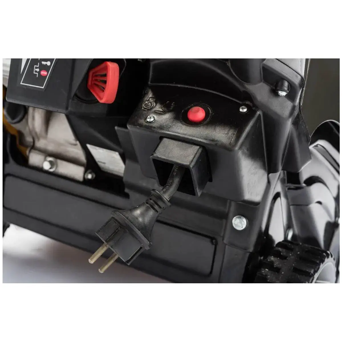 Бензиновый снегоуборщик оснащен двигателем объемом 87 см3. Быстрый запуск прибора обеспечивается наличием электростартера. Металлический шнек с резиновыми накладками позволяет качественно очистить от снега территорию, не повреждая декоративное покрытие. Рабочая ширина – 46 см, диаметр шнека – 17 см, снежная масса выбрасывается на расстояние до 6 метров через пластиковый желоб с углом наклона 90° и углом поворота 180°, которые регулируются двумя удобным рукоятками.