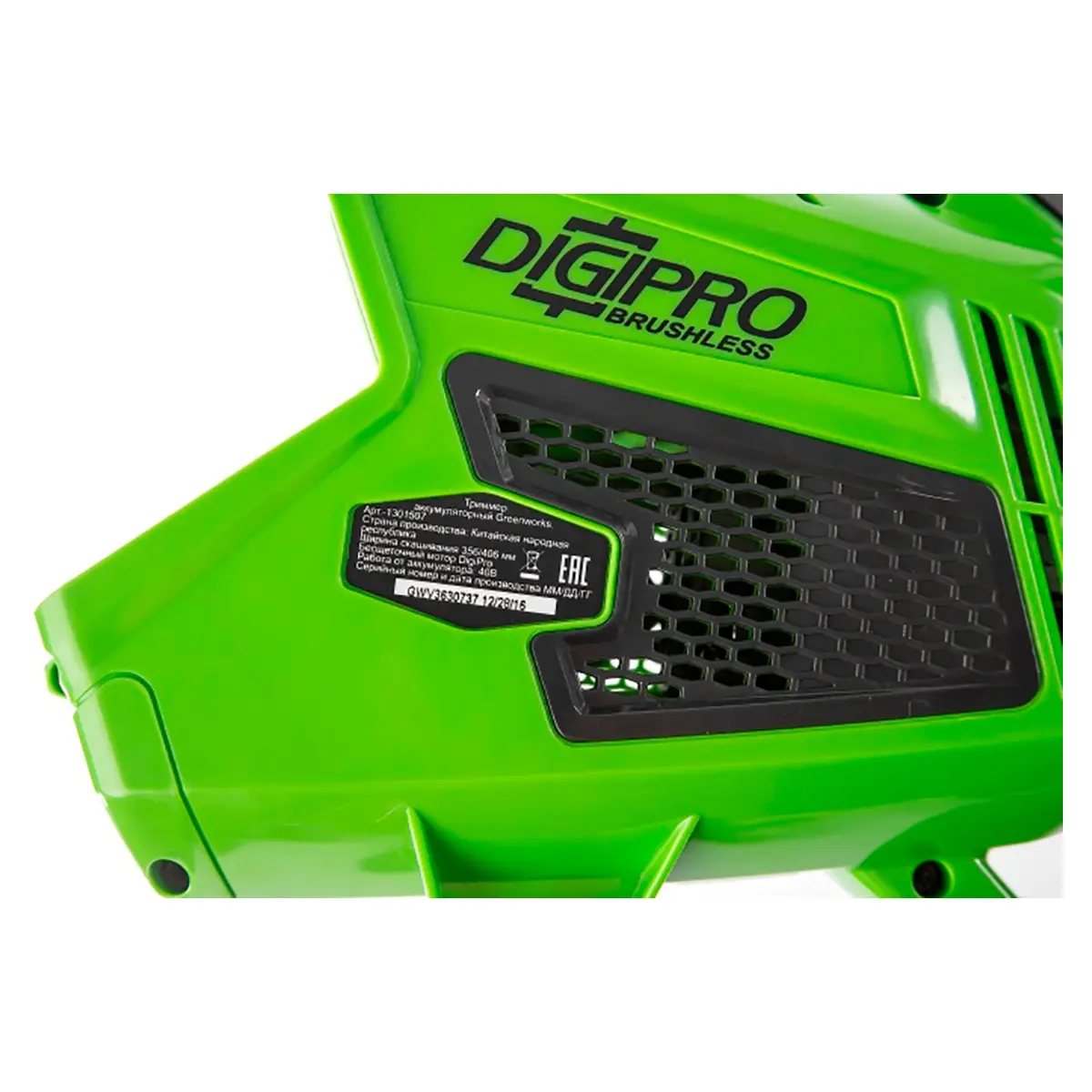 Аккумуляторный триммер Greenworks GD40BC оборудован бесколлекторным электромотором постоянного тока, изготовленным по технологии DigiPRO Brushless. Благодаря повышенному вращающемуся моменту устройство характеризуется улучшенной производительностью. Приводной узел, размещенный в верхней части составной штанги, передает вращение на косильную головку с помощью внутреннего вала.