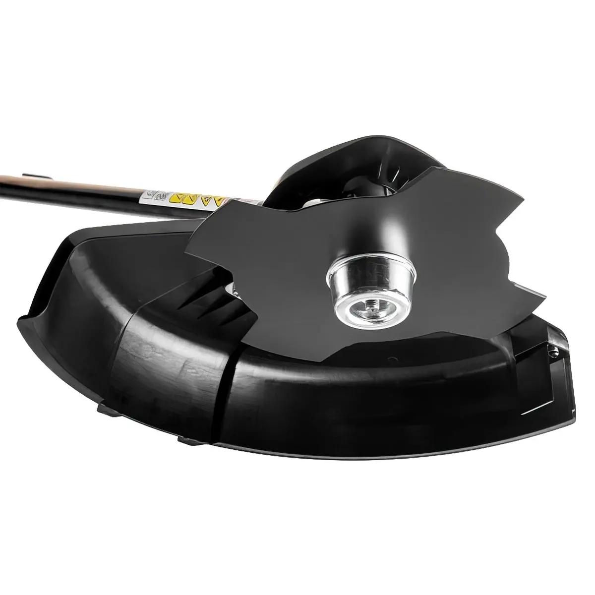 - Эффективность – триммер может использоваться с разнотипной оснасткой: косильной леской на шпуле или режущим диском. Модель поддерживает два скоростных режима, позволяя выполнять как стрижку мягкой поросли, так и скашивание дикорастущих растений с жесткими стеблями.