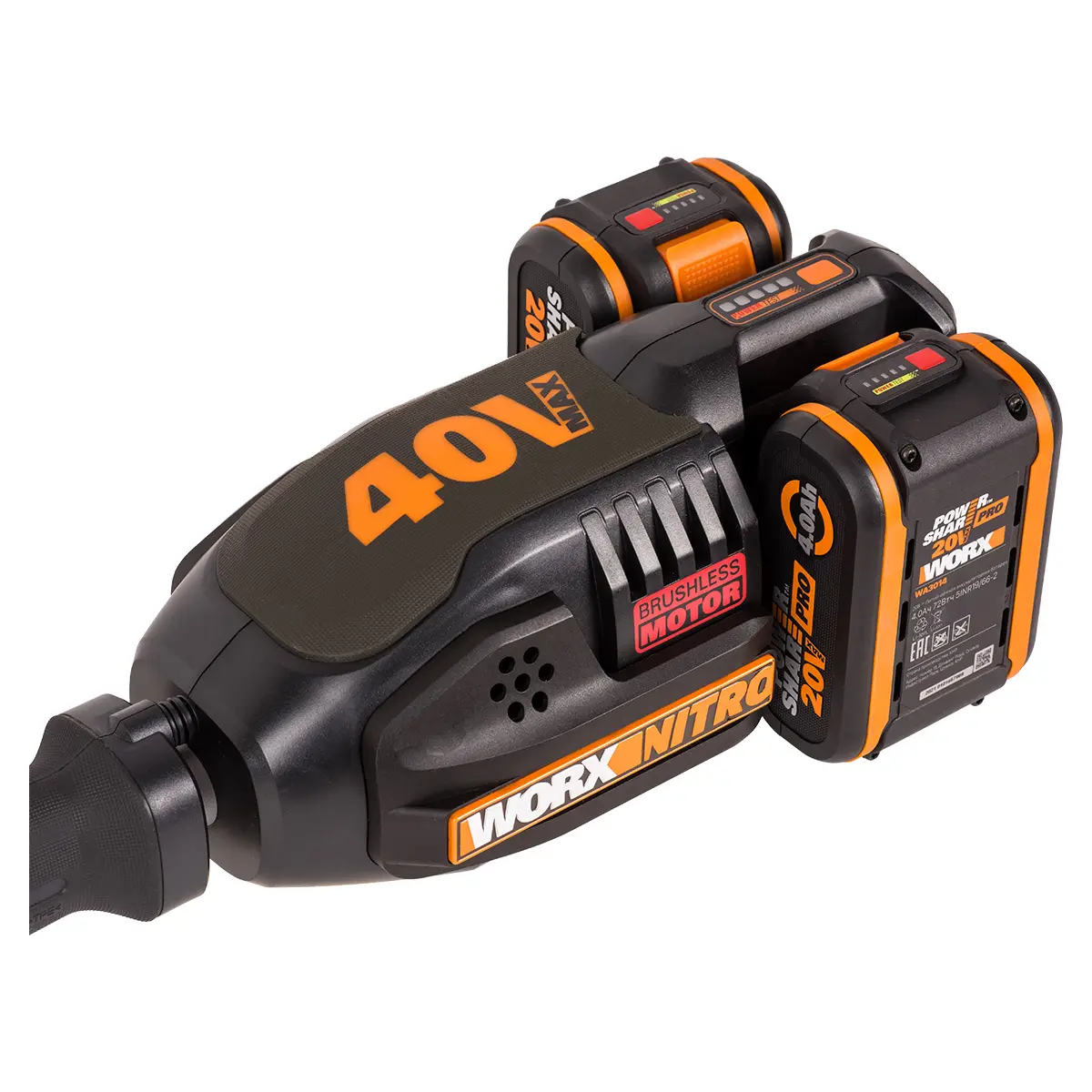 Питание мотора осуществляется за счет литий-ионного аккумулятора нового поколения WORX Poweshare PRO 20В, который идет в комплекте с инструментом, как и зарядное устройство.
