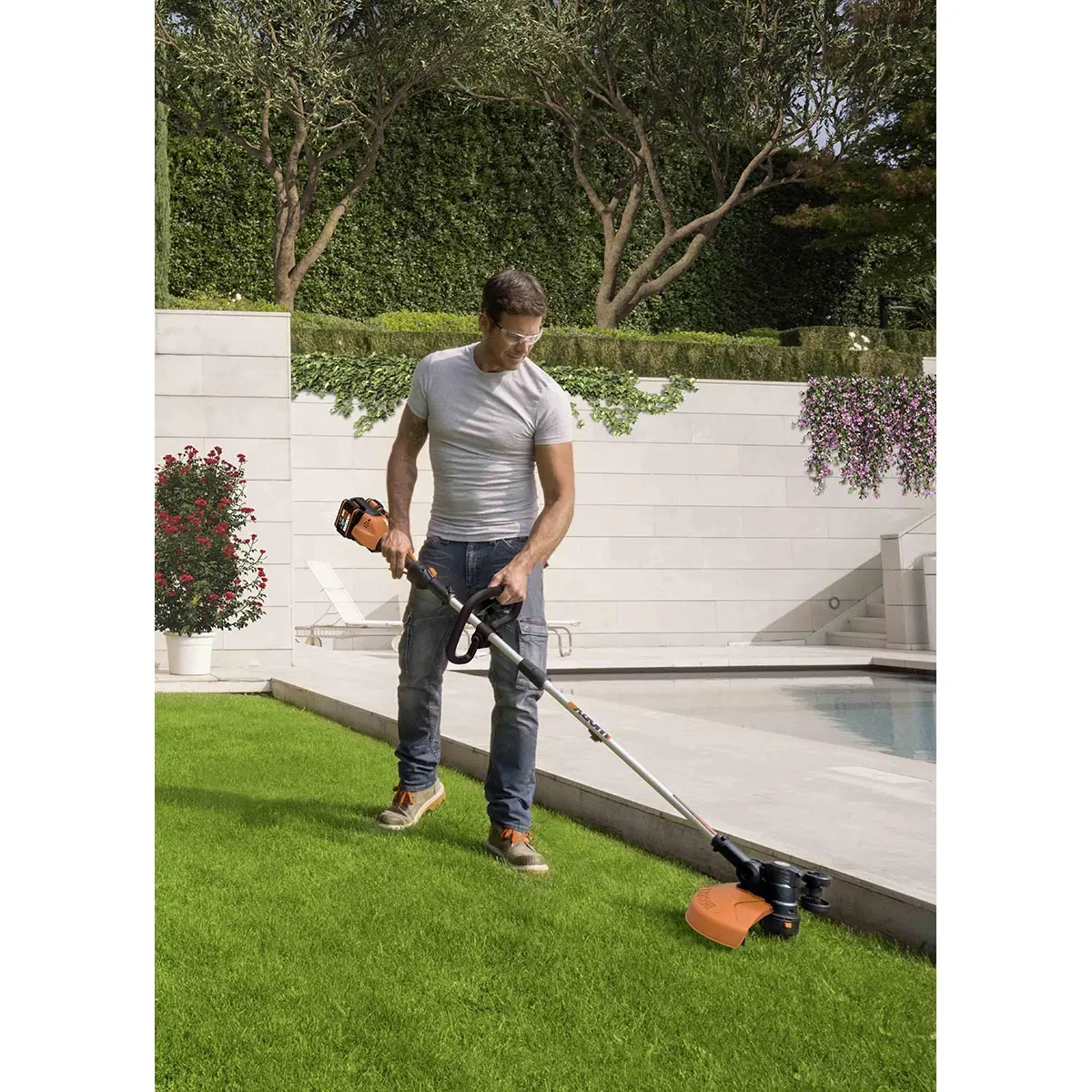 Инструмент представляет собой не только средство для стрижки травы, но и кромкорез. Изменение режимов работы осуществляется одним касанием, что делает использование устройства максимально удобным и интуитивно понятным. Поворотная головка и возможность регулировать угол наклона дают возможность адаптировать триммер WORX WG184E.9 под особенности участка.