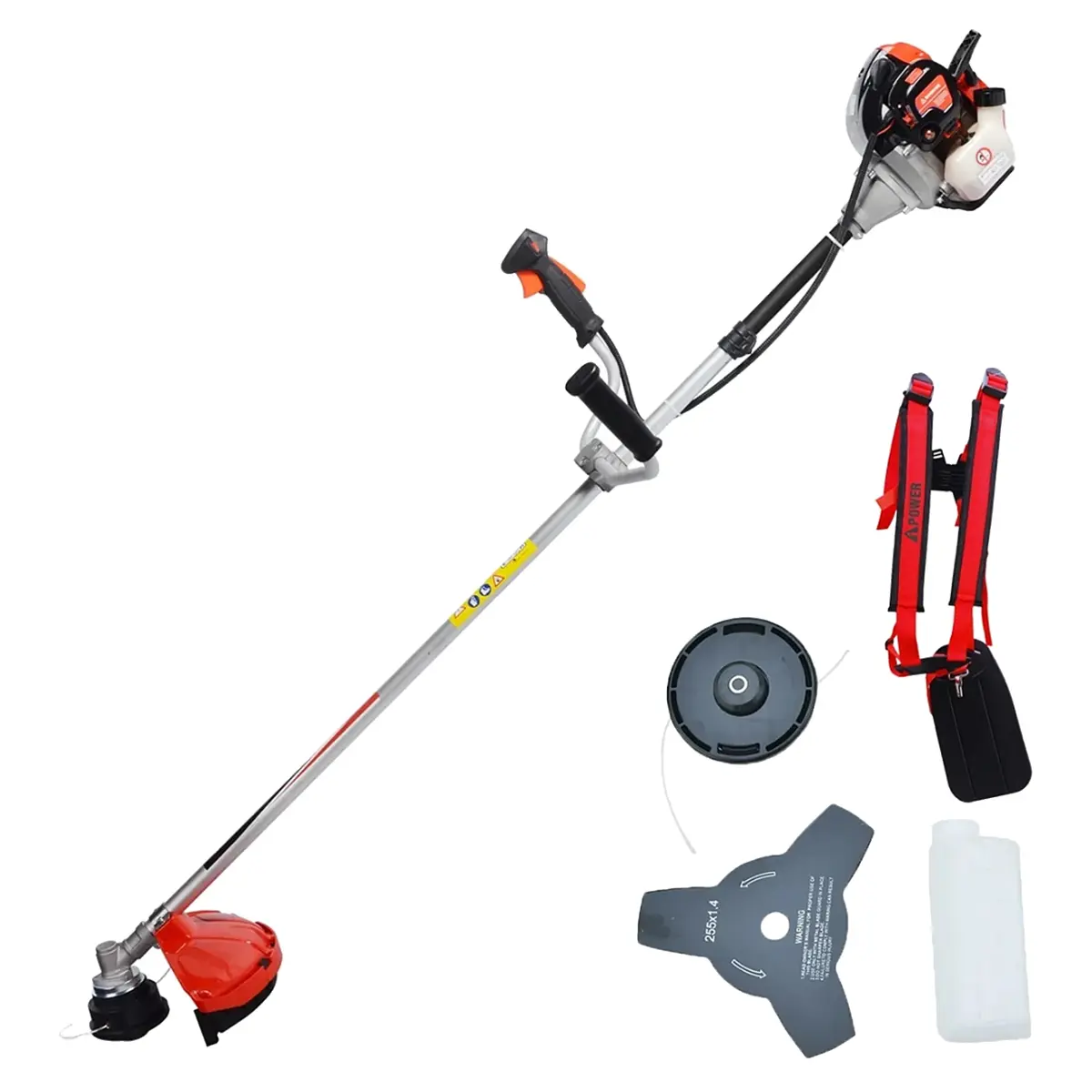 Садовый триммер оснащен двухтактным бензиновым двигателем объемом 51,7 кубических сантиметра и мощностью 1,4 кВт. Такой двигатель обеспечивает отличную производительность, позволяя эффективно справляться с большими объемами работ на участках площадью 15-20 соток. Топливный бак в 0,7 литра дает возможность работать продолжительное время без необходимости частой дозаправки.