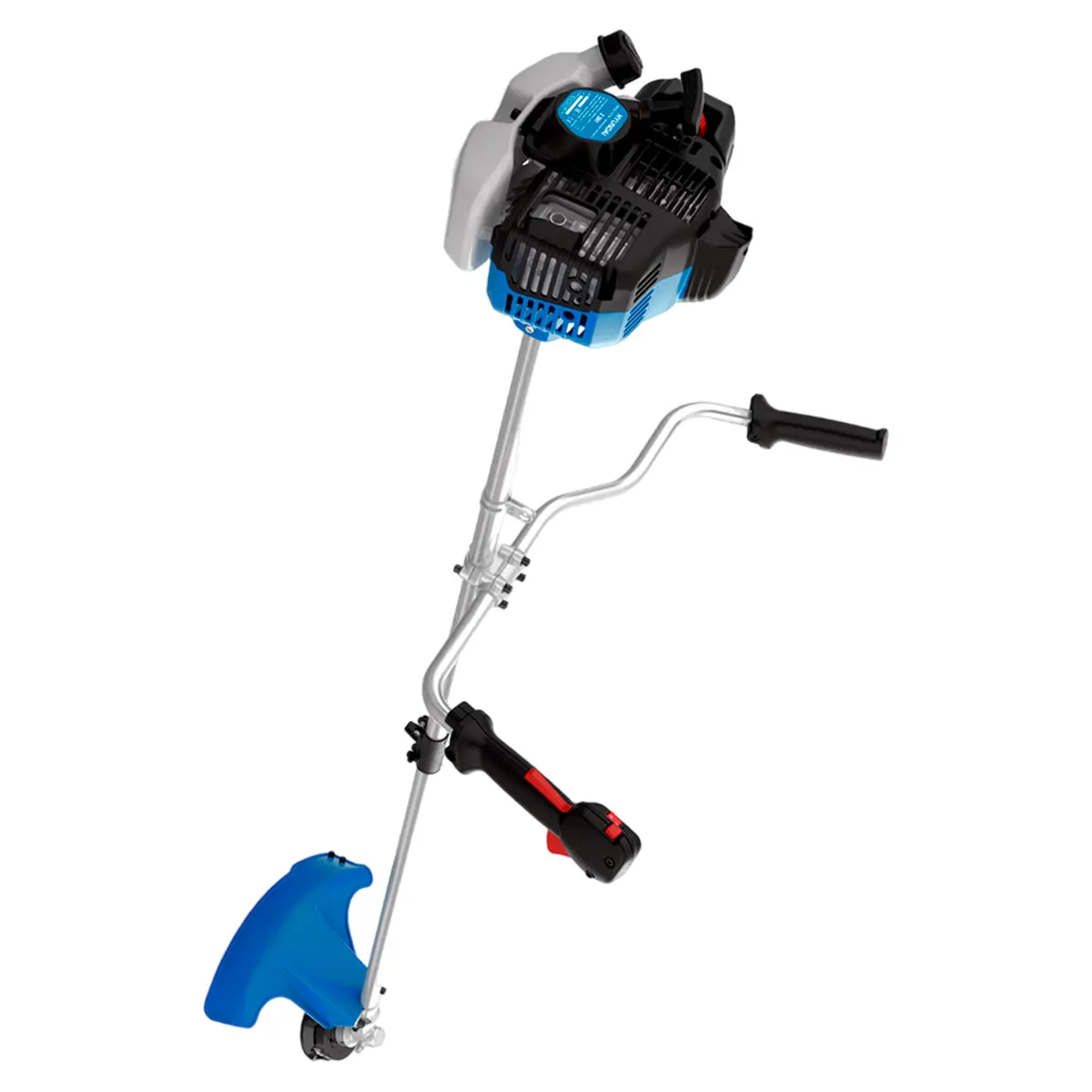 Все элементы управления встроены в рукоятку велосипедного типа с прорезиненными нескользящими ручками. Через полупрозрачные пластиковые стенки бензобака объемом 0,5 л удобно отслеживать уровень топлива. Бензокосу с разъемным валом можно перевозить в легковом автомобиле. В комплекте предусмотрен плечевой ремень, который помогает полностью контролировать положение триммера во время работы. Защитный кожух полукруглой формы из пластика защищает пользователя от вылетающих из-под режущего механизма растений.