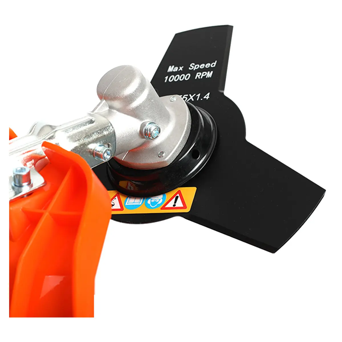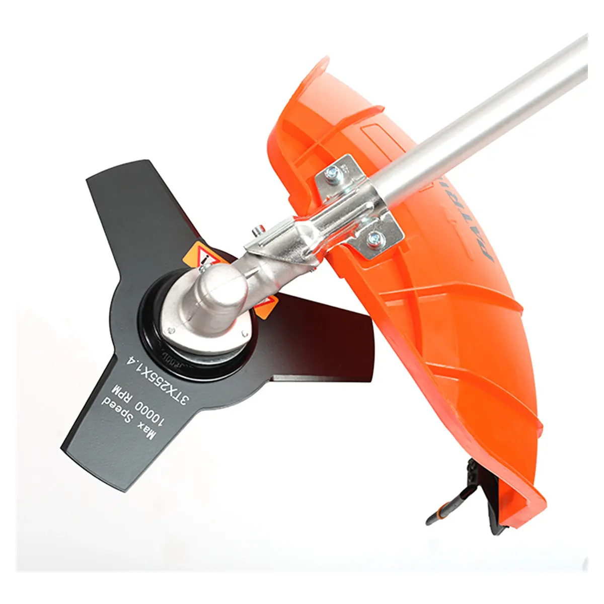 40-зубый металлический пильный нож подходит для срезания кустарников и молодых побегов деревьев. Трехлопастное лезвие и катушка с леской-кордом предназначены для работы с густыми зарослями и на участках с препятствиями, такими как деревья или камни.