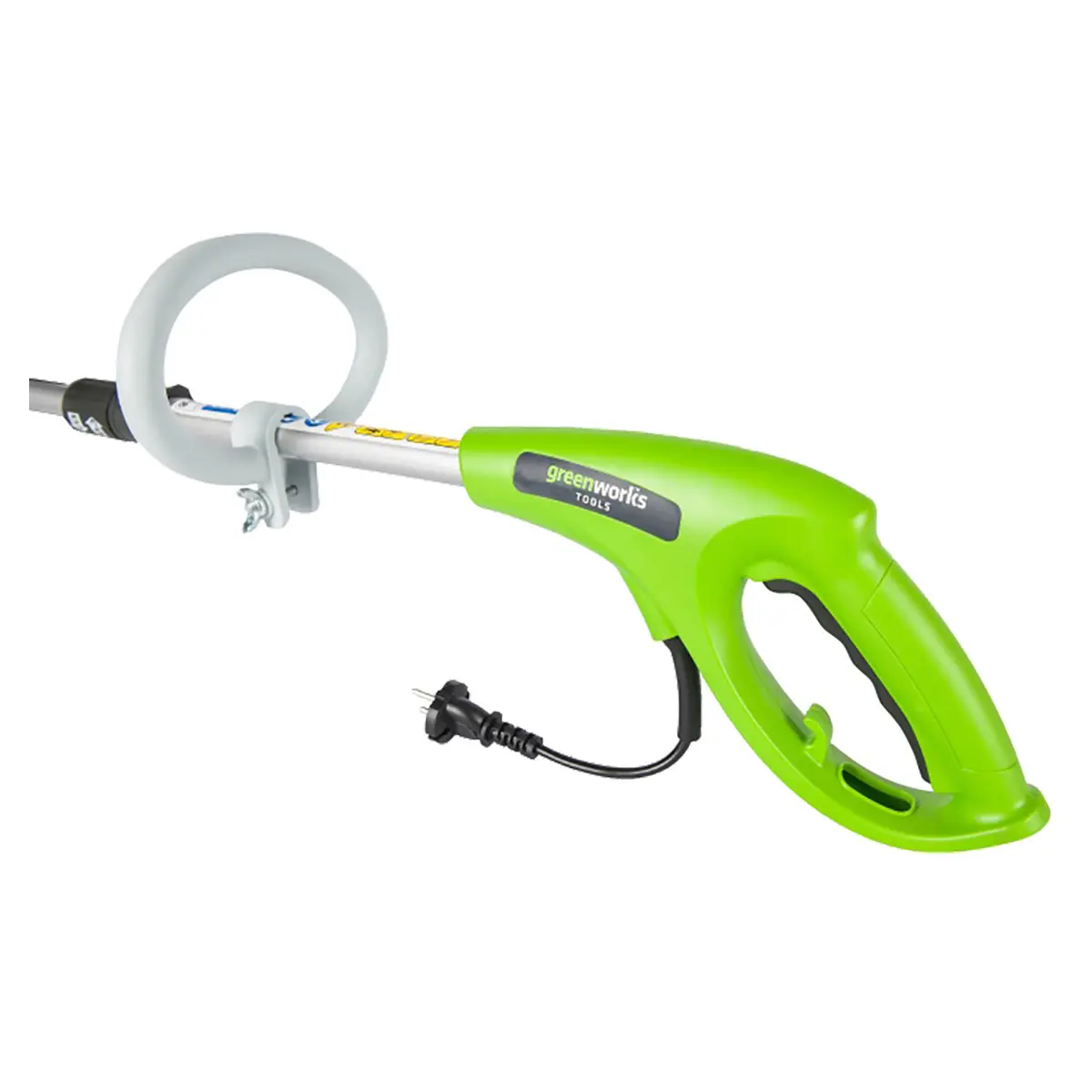 Положение дополнительной передней ручки можно изменять, подгоняя электрический триммер Greenworks GST5033 "под себя". Для повышения комфортности и безопасности работ предусмотрена возможность фиксации шнура удлинителя на рукоятке инструмента, для чего в нижней части скобы выполнена прорезь и размещен крючок с внутренней стороны. Такая конструкция поддерживает штепсельное соединение без натяжения кабеля, за счет чего исключается непреднамеренное выдергивание вилки из розетки.