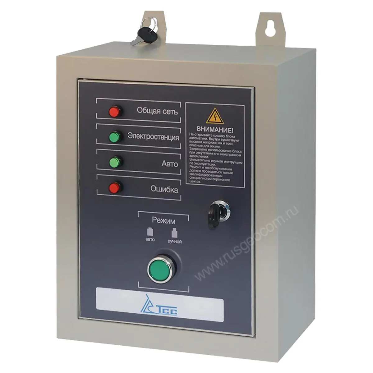 Коммутационное оборудование заключено в металлический кожух, который защищает электронику от пыли и воды. Кожух, при необходимости, можно закрыть на замок - актуальная функция с учетом того, что внутри блока АВР-С TSS 9000D/230 расположены провода под напряжением. Кроме того, такая особенность поможет предотвратить нежелательный доступ.