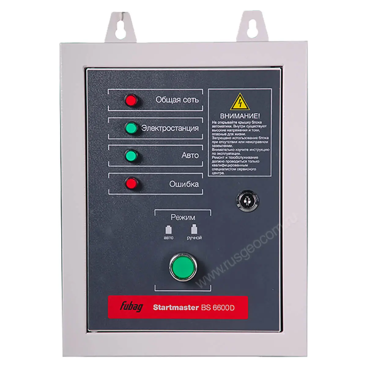 Встроенный в блок автоматики Startmaster BS 6600 D модуль управления контролирует уровень напряжения в энергосистеме и при его падении выполняет запуск подключенного трехфазного бензогенератора. После выхода электростанции на рабочий режим коммутационным устройством производится переключение потребителей на автономный источник питания. В случае восстановления централизованного электроснабжения автоматика осуществляет обратную перекоммутацию нагрузок и глушит двигатель генератора FUBAG , переводя его в дежурный режим.
