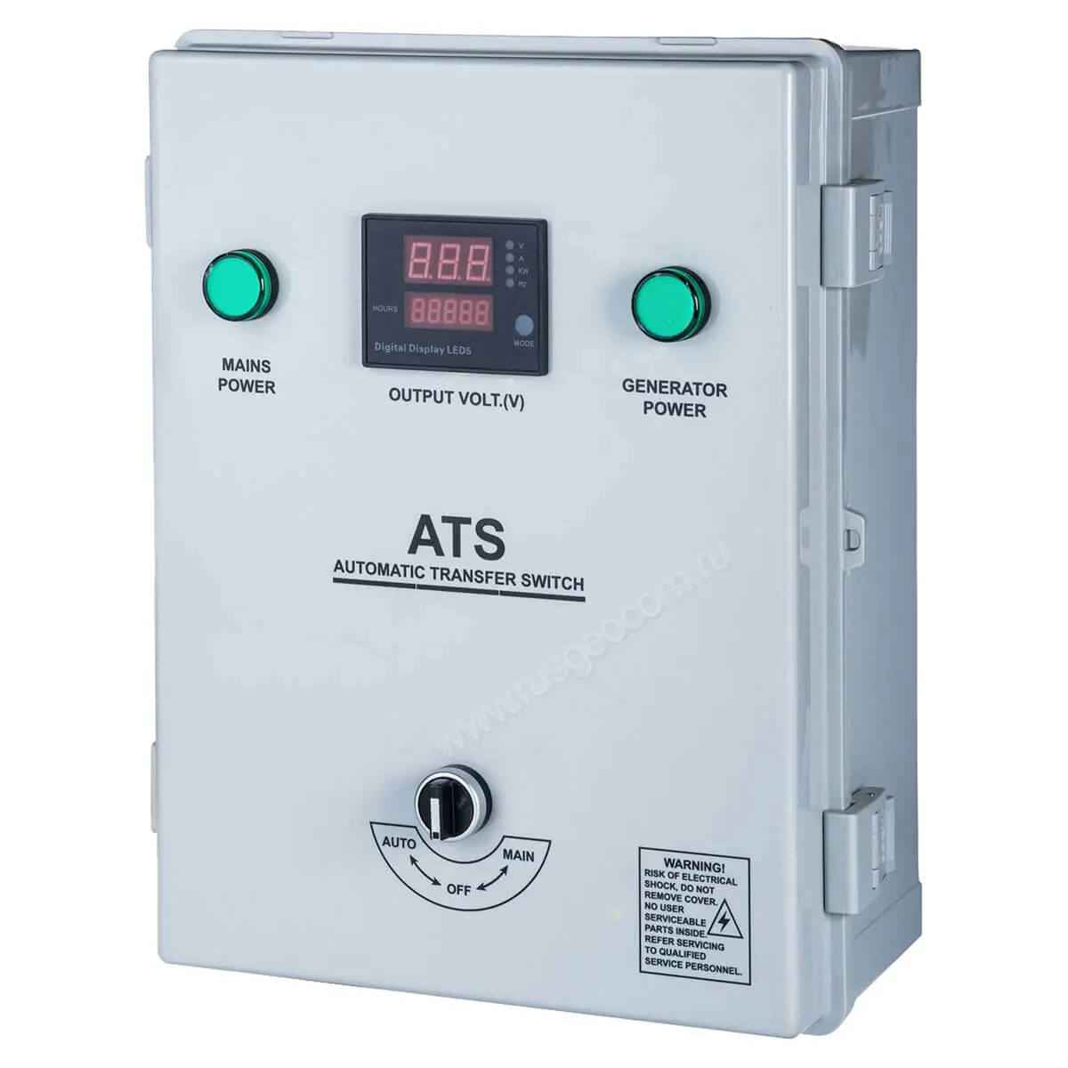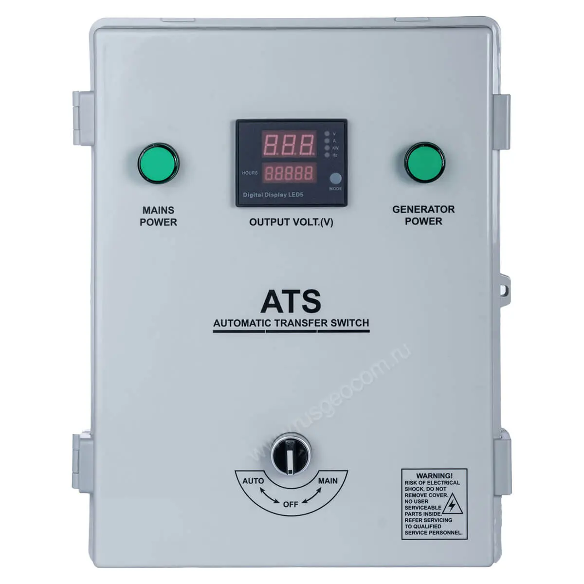 Контроллер блока автоматики Hyundai ATS 10-380 снабжен цифровым дисплеем, который размещен на передней панели. Благодаря этому в ходе работы системы можно визуально отслеживать номинал подаваемого на нагрузку напряжения, частоту, силу потребляемого тока, мощность, учитывать общую наработку, а в случае ошибки – определять ее по коду.
