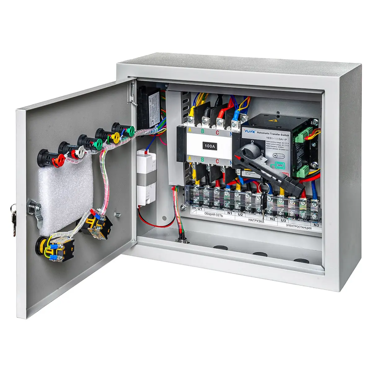 - Автоматический реверсивный рубильник: Обеспечивает безопасное и надежное переключение нагрузки.