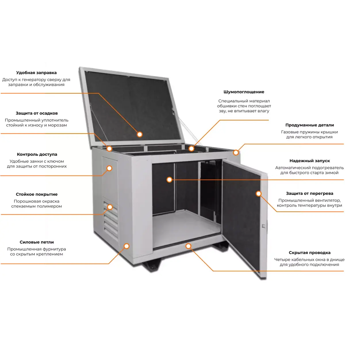 Если резервное энергоснабжение дома необходимо вам круглый год, то мы рекомендуем заказать кожух в зимней комплектации, которая включает экономичный обогреватель и воздушный клапан с электроприводом, позволяющий минимизировать теплопотери. Зимний комплект - это гарантия запуска и бесперебойной работы электростанции даже в сильные морозы.