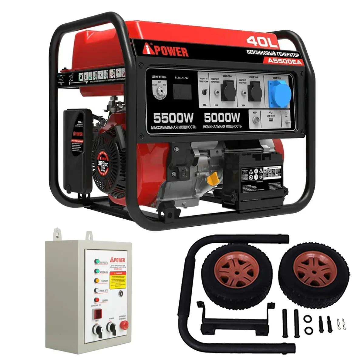 Бензиновый генератор A-iPower A5500EA + блок автозапуска A-iPower 230 В, 50 А + транспортировочный комплект A-iPower L - топовая модификация 5-киловаттной линейки производителя, которая оборудована электростартером, коннектором для подключения опционального блока автозапуска и большим топливным баком на 40 литров, благодаря чему установка может работать до 11 часов при максимальной нагрузке.