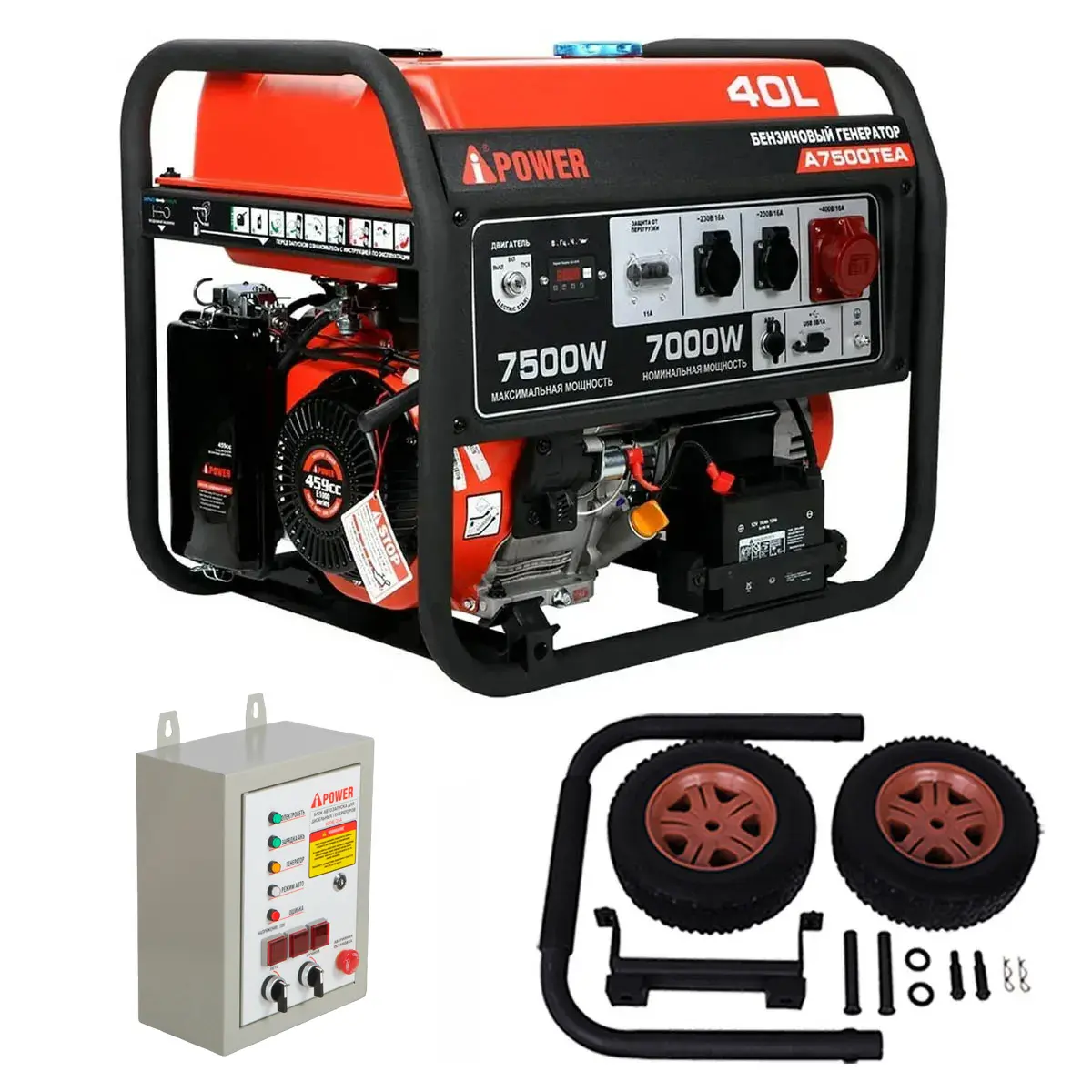Бензиновый генератор A-iPower A7500TEA + блок автозапуска A-iPower 400 В, 25 А + транспортировочный комплект A-iPower L - трехфазная модификация 7-киловаттной модели с электростартером и коннектором для подключения опционального блока автозапуска. Покупка такого оборудования особенно актуальна для тех, кому необходимо обеспечить непрерывное функционирование мощного трехфазного потребителя - станка, сварочного аппарата, насоса, подъемника, котла и др. При других вариантах подключения, особенно когда речь идет об однофазных потребителей, следует заранее продумать схему, чтобы избежать перекоса фаз.