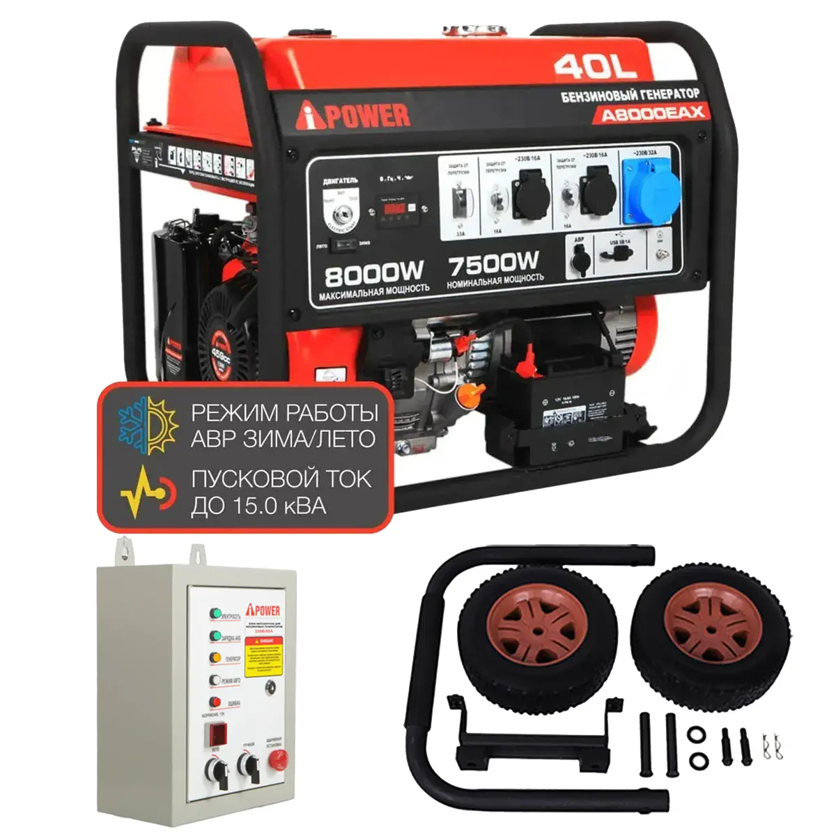Бензиновый генератор A-iPower A8000EAX + блок автозапуска A-iPower 230 В, 50 А + транспортировочный комплект A-iPower L - надежный источник питания мощностью 7.5 кВт. Главные преимущества модели - до 10 часов работы на одном баке топлива и возможность подключения высоко индуктивных приборов с пусковой мощностью до 15 кВA.