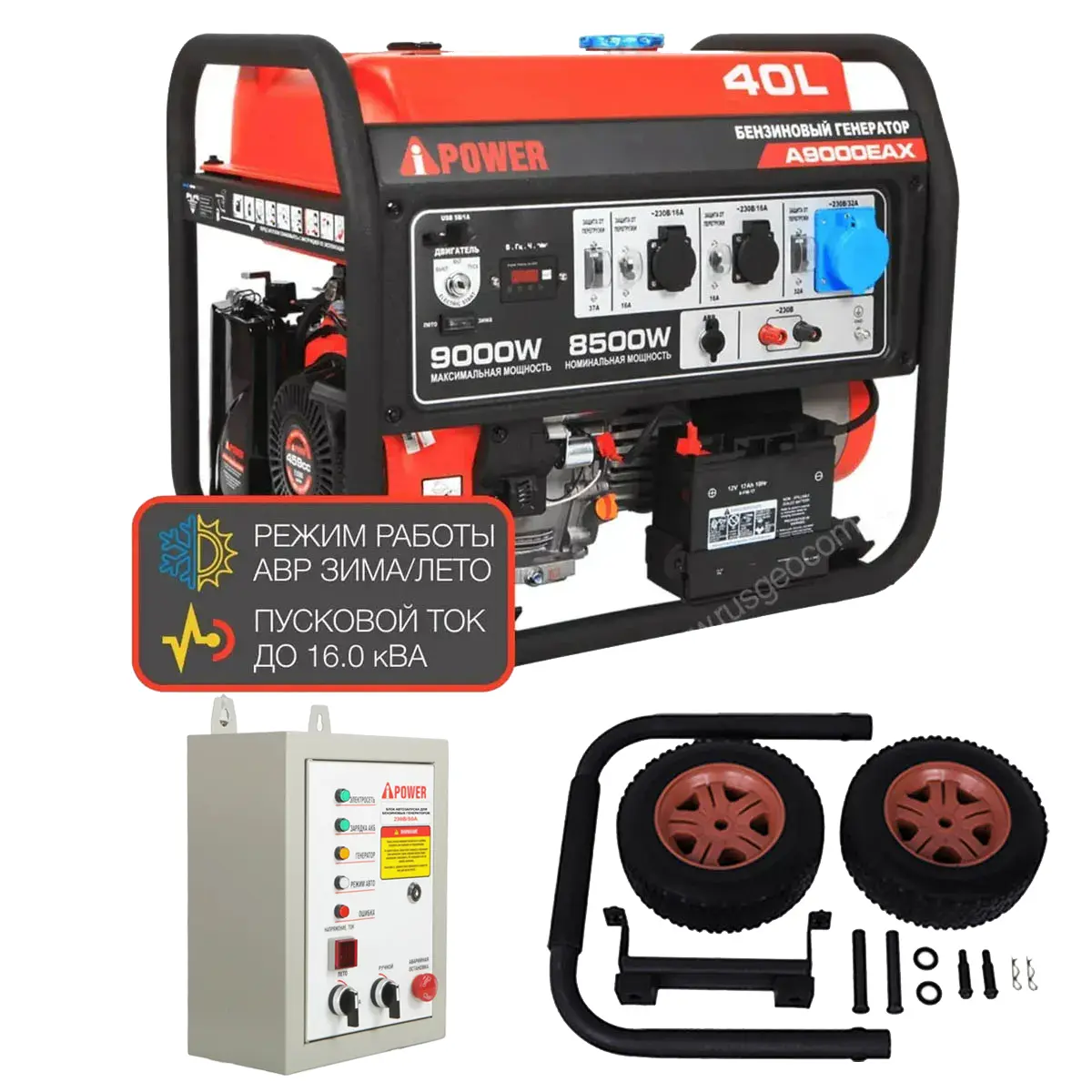 Бензиновый генератор A-iPower A9000EAX + блок автозапуска A-iPower 230 В, 50 А + транспортировочный комплект A-iPower L - надежный источник питания мощностью 8.5 кВт. Главное преимущество этой и других моделей производителя с индексом X заключается в способности выдерживать большую пусковую мощность, в данном случае - до 16 кВА. Такая особенность делает установку отличным выбором для работы с профессиональным ручным инструментом и электродвигателями.