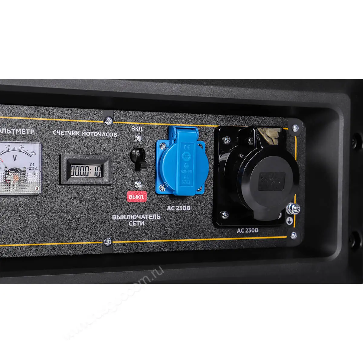 Объем бака для бензина – 15 л, что позволяет эксплуатировать агрегат на протяжении 8-10 часов без дозаправки, в зависимости от нагрузки. Синхронный альтернатор с обмоткой из меди гарантирует подачу стабильного выходного тока и продолжительный период работы. У Champion GG5000 есть розетка на 220 В, 16 А, а также силовая розетка на 32 А для подключения приборов большой мощности. Кроме того, на панели расположен стрелочный вольтметр и счетчик моточасов.