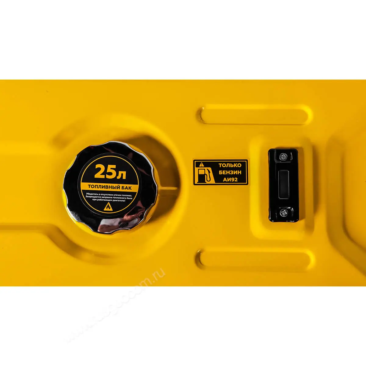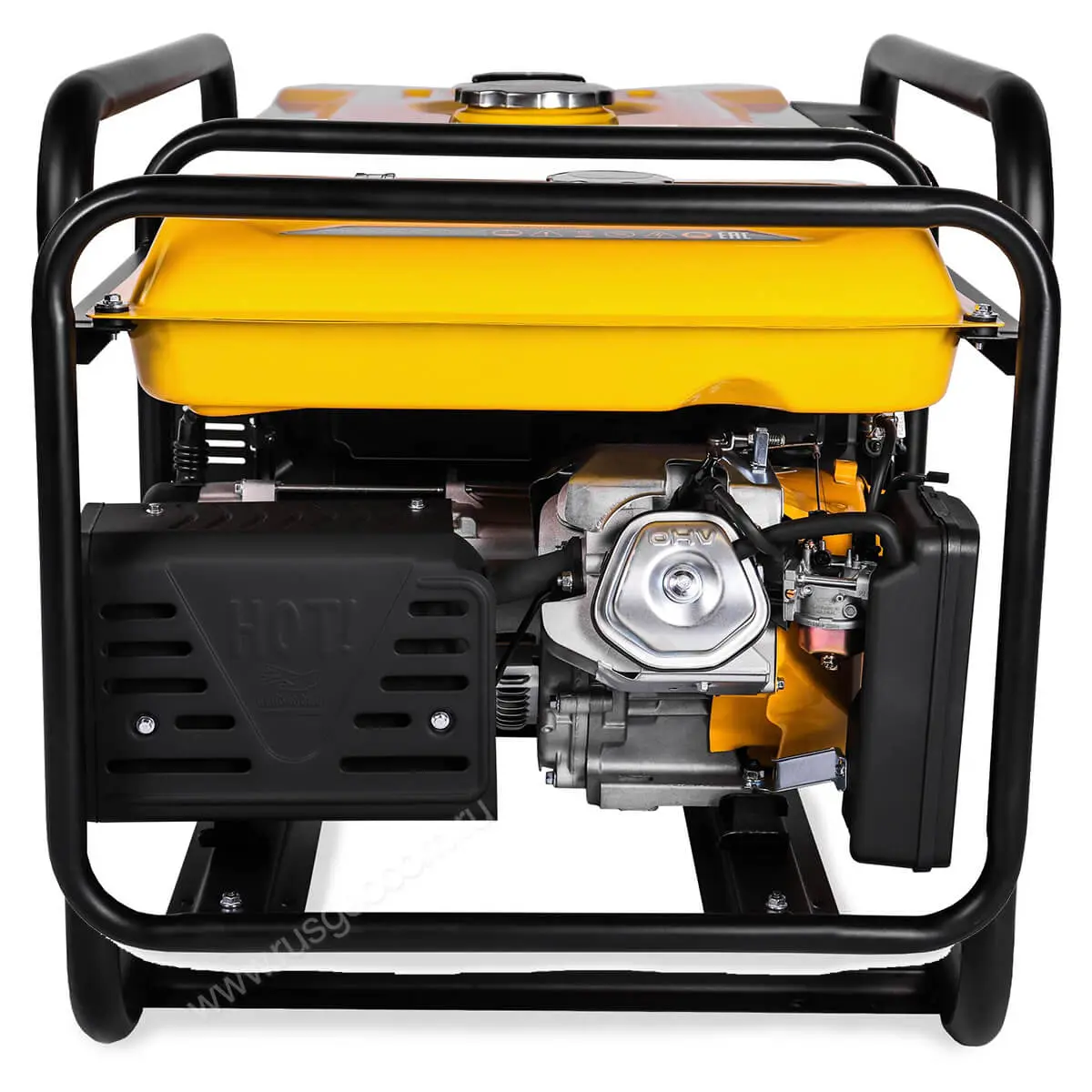 Бензиновый генератор имеет открытый тип конструкции – с усиленной металлической рамой, защищающей узлы от повреждений. На модели установлен 4-тактный двигатель, запускающийся с помощью ручного стартера. Выходное напряжение – однофазное 230 В.