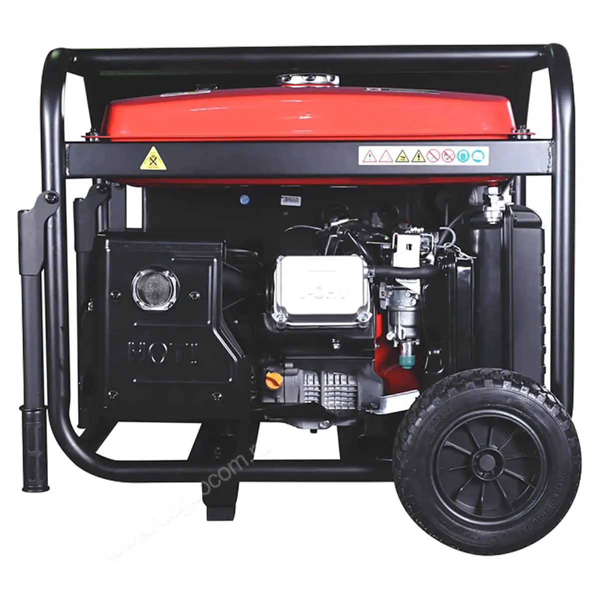 Встроенные колеса и откидные ручки значительно упрощают перемещение бензогенератора по объекту. Амортизирующие упоры с резиновыми подушками гасят вибрации от работы двигателя и препятствуют опрокидыванию при установке на неровном грунте.