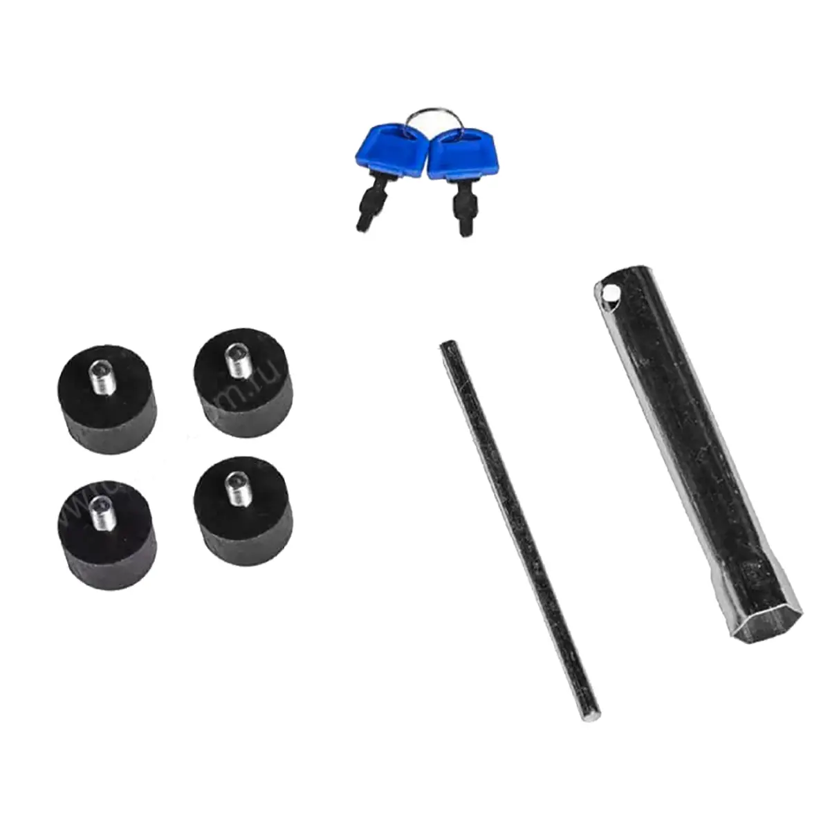 В наборе с агрегатом поставляются полезные аксессуары - вилка, которая поможет подключить к нему потребителей, свечной ключ для обслуживания и резиновые ножки. Последние отлично дополняют амортизирующие подушки, на которых смонтирован двигатель, гасят вибрации, снижают шум и повышают устойчивость при установке на неровной поверхности.