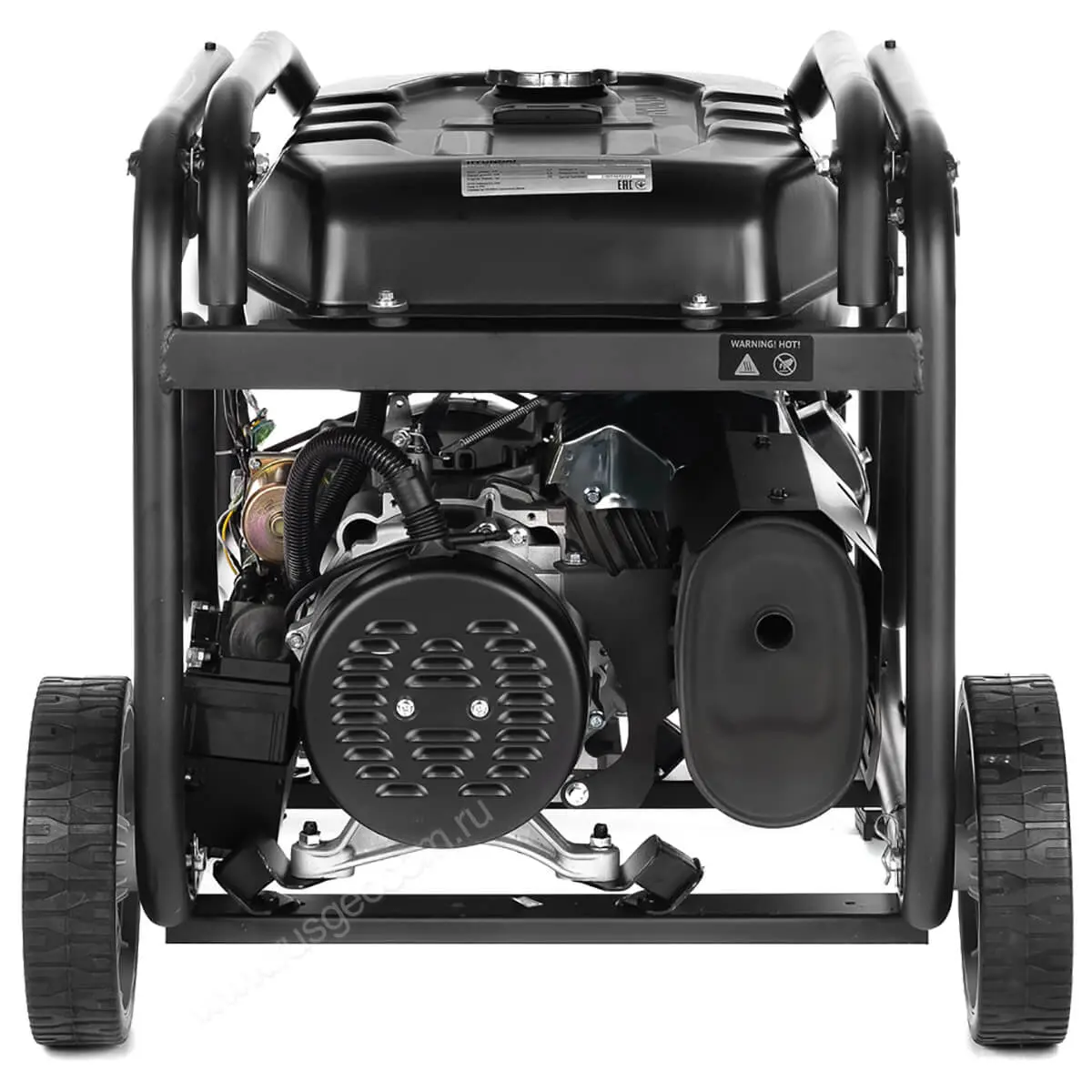 Бензиновый генератор оснащен двумя розетками - стандартной, евро-формата, для работы с нетребовательными приборами и силовой, на 32А, для снятия полной мощности и питания высоконагруженного оборудования. Также на передней панели расположены клеммы постоянного тока 12В для зарядки аккумуляторов и подключения устройств, как правило, рассчитанных на автомобильную сеть.