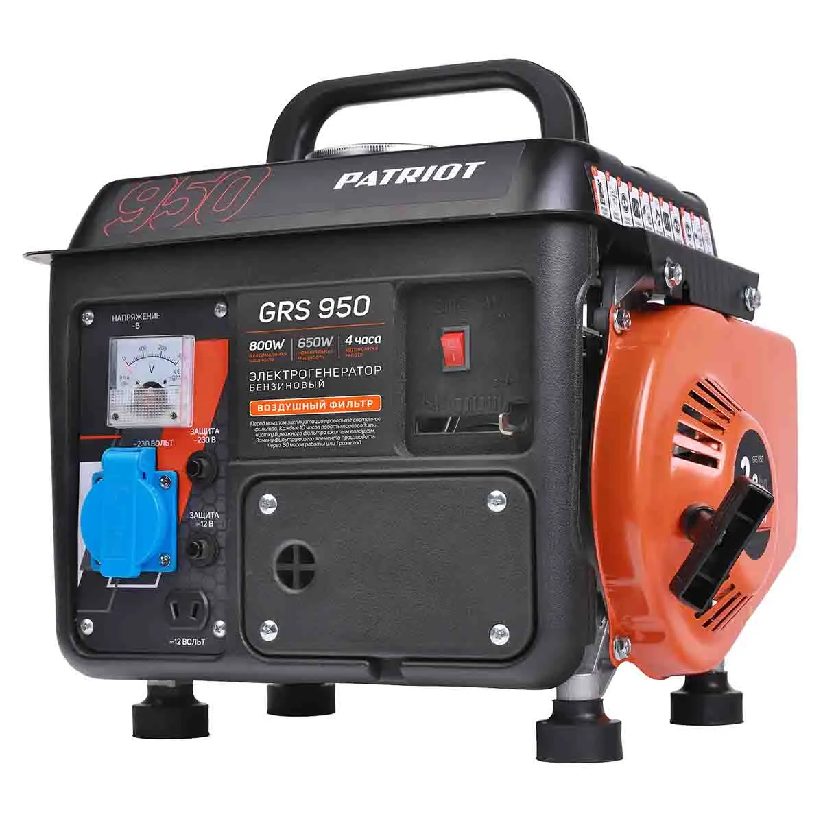 Бензиновый генератор Patriot GRS 950 - компактная и легкая модель с максимальной мощностью 800 Вт, которая предназначена для организации питания маломощный приборов и электроинструментов. Электростанция с двухтактным двигателем легче и проще в обслуживании, чем аналоги с четырехтактными моторами, что делает ее оптимальным выбором для использования на выезде - на даче, в походе, в путешествии или на рыбалке.