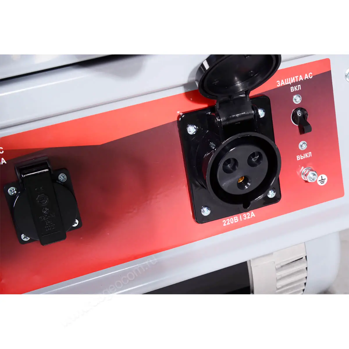- Агрегат оборудован двумя розетками на 16 А и одной на 32 А, что позволяет подключать различные бытовые приборы и обеспечивает гибкость в использовании.