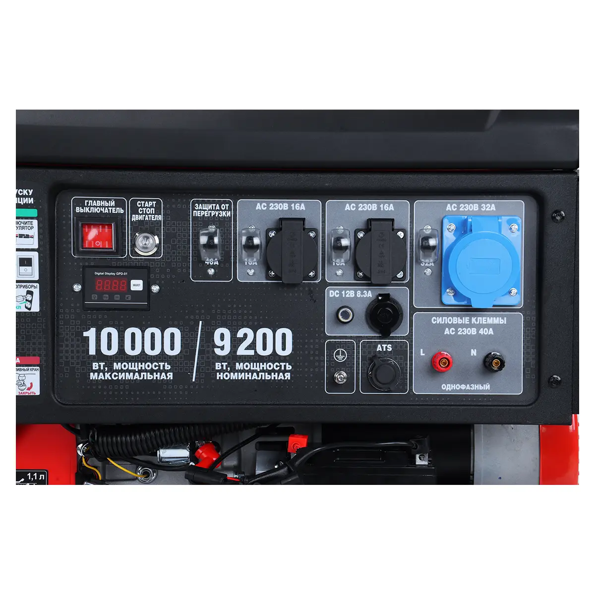 Топливный бак 40 литров обеспечивает до 9,5 часов непрерывной работы от одной заправки при нагрузке 75% (7 кВт) и до 7,5 часов при номинальной нагрузке (9,2 кВт).