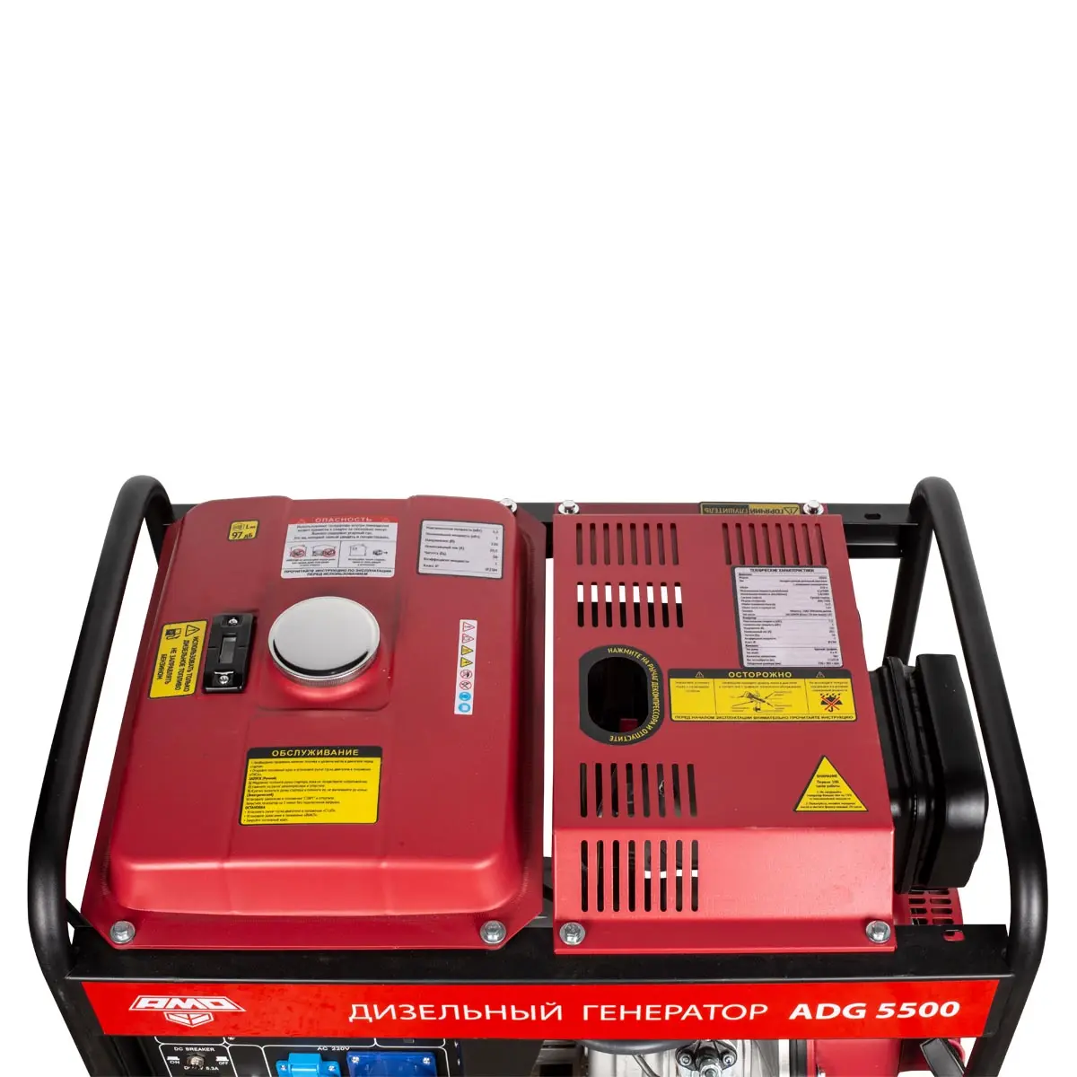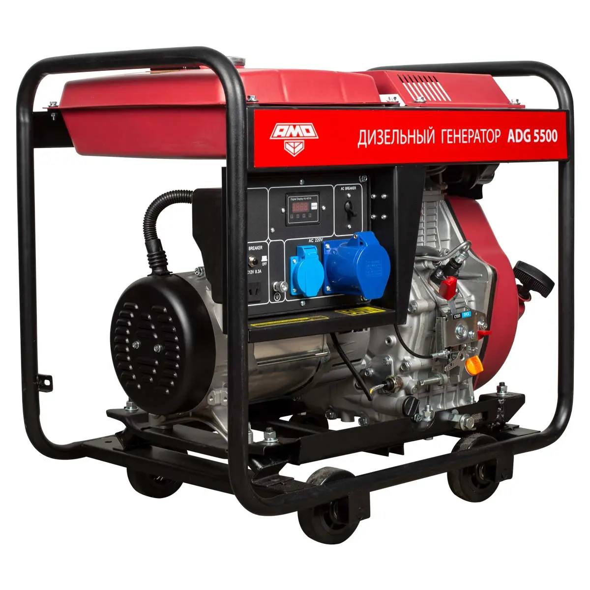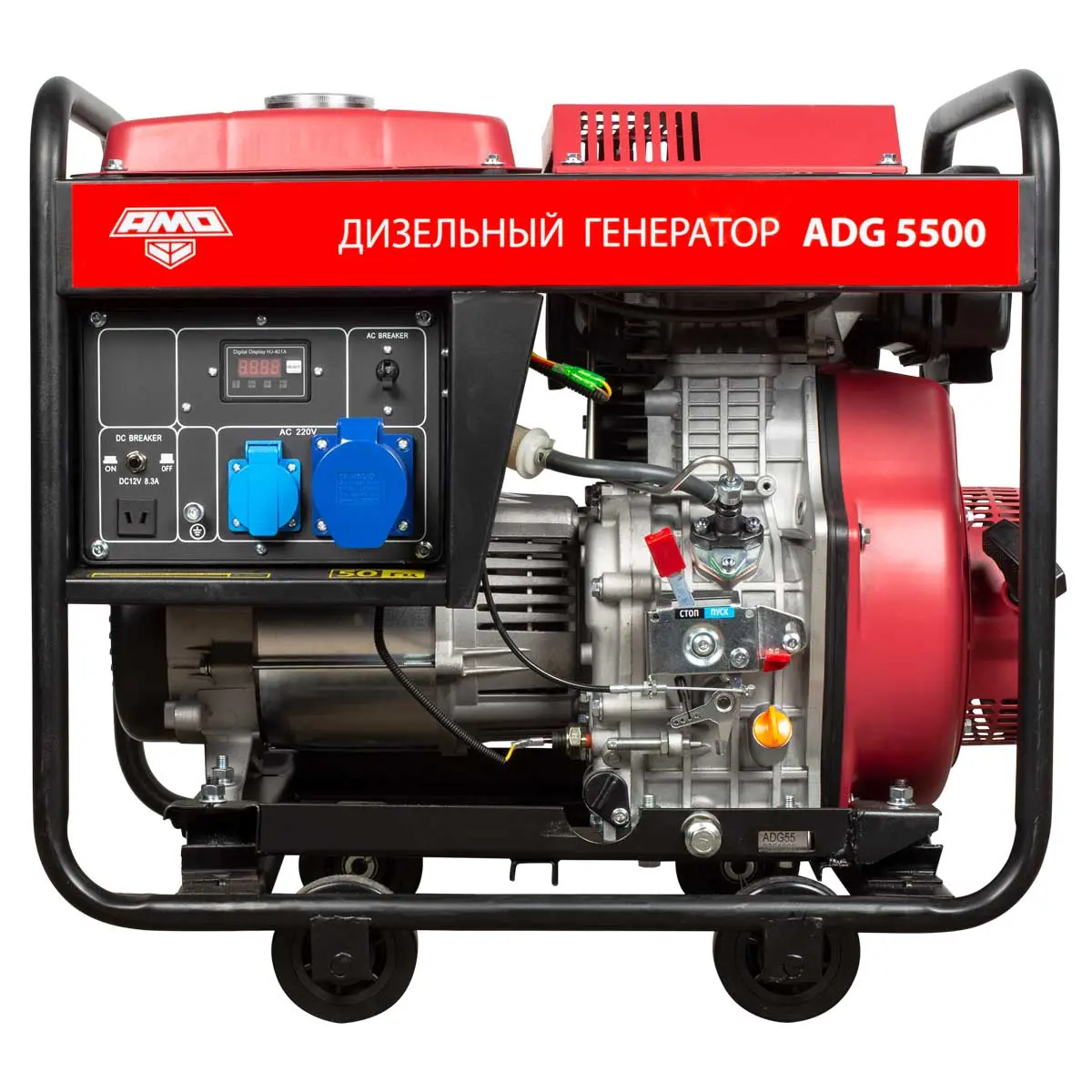 На передней панели дизель-генератора AMO ADG 5500 расположен информационный дисплей, на котором удобно контролировать параметры тока и отслеживать наработку установки для своевременного проведения обслуживания.