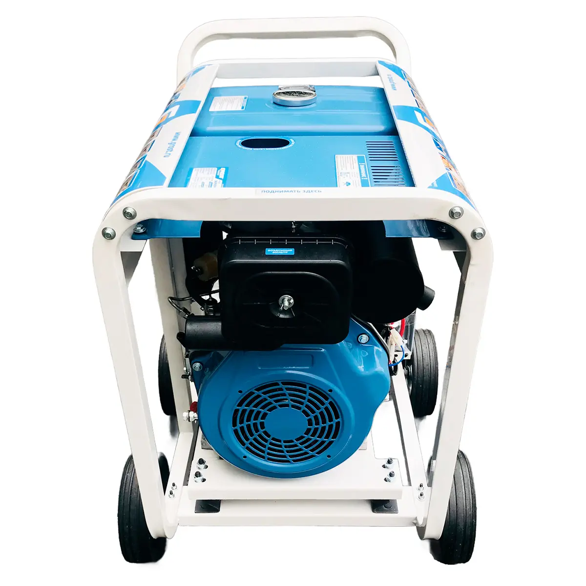Дизельный генератор GROST DG9000CXE-3 позволяет запитывать одно- и трехфазное оборудование переменного тока с максимальной потребляемой мощностью 8,5 кВА, обеспечивая временное или аварийное энергоснабжение бытовых, коммерческих или промышленных объектов, либо инструментарий аварийных бригад и выездных подразделений. Как автономная электростанция профессиональной категории, данное изделие способно выдерживать интенсивные продолжительные нагрузки, для чего оснащается трехфазным синхронным альтернатором, с медными обмотками и системой авторегулировки напряжения AVR, приводимым в действие одноцилиндровым 4-тактным двигателем объемом 0,66 л, сочетающим в себе мощность и экономичность. Установка оборудована электрическим стартером, работающим от комплектного аккумулятора, и стандартно поддерживает режим автозапуска, что позволяет использовать агрегат в составе систем резервного питания, дооснастив блоком АВР, который поставляется отдельно.