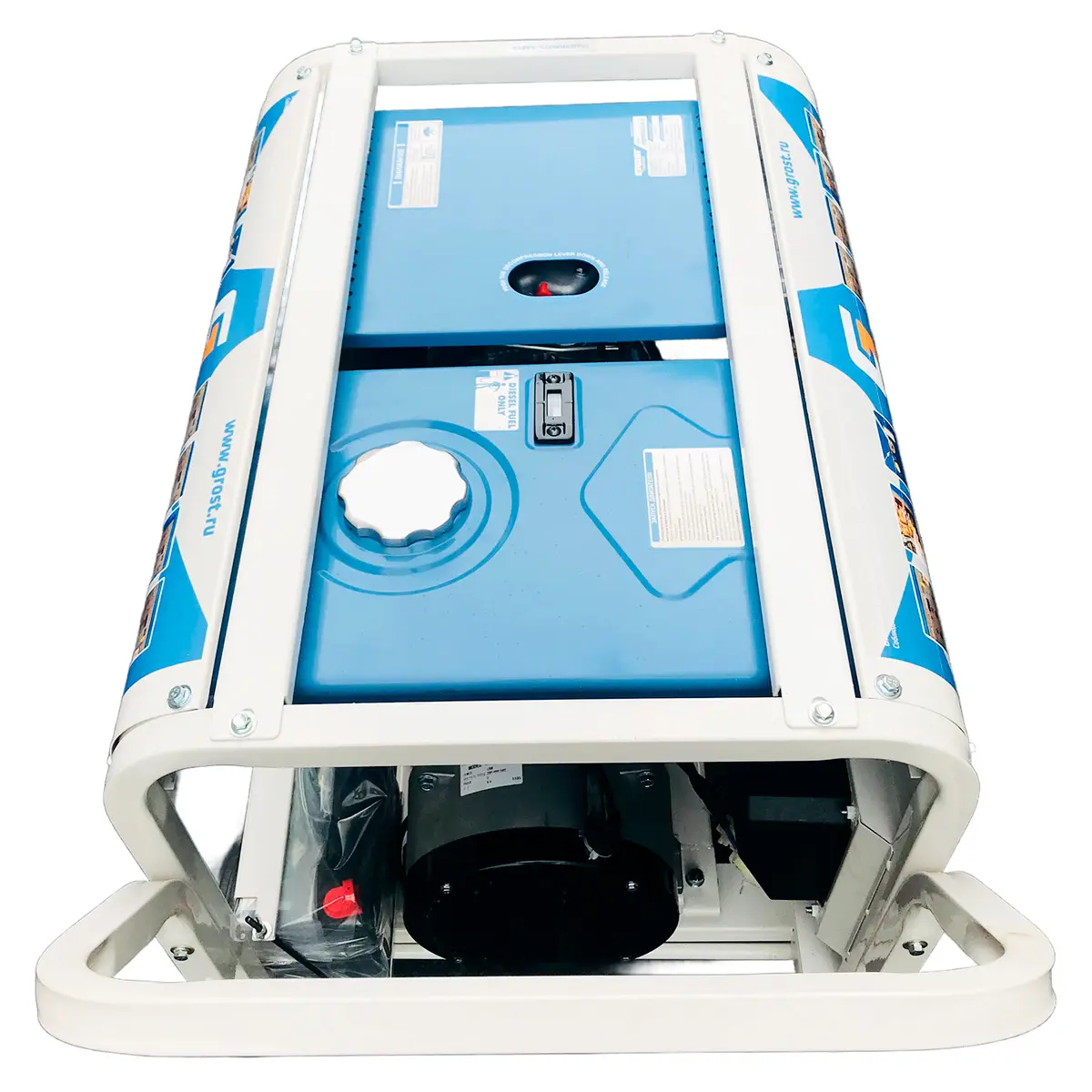 Благодаря открытой конструкции агрегата обеспечивается простой доступ к основным узлам в ходе обслуживания и ремонта. Двигатель с альтернатором размещены на дополнительном опорном основании, которое крепится к основной раме через демпфирующие подушки. Это способствует минимизации уровня вибраций генератора GROST DG9500CXE-3 в процессе работы и, соответственно, снижению шумности. Топливный бак снабжен указателем уровня, по которому можно визуально контролировать остаток горючего.