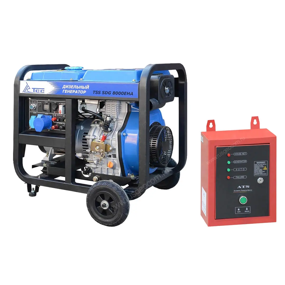 Дизельный генератор TSS SDG 8000EHA с АВР - это готовый комплект оборудования, который представляет собой комплексное решение для резервного энергоснабжения бытового, строительного или торгового объекта. Набор состоит из 7.5-киловаттной электростанции профессионального класса, блока электроники автозапуска и различных аксессуаров для подключения нагрузки к генератору.