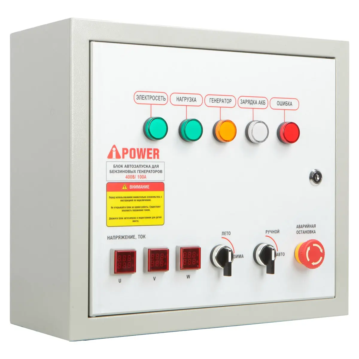 На дисплее отображаются все параметры выходного тока, по которым можно контролировать состояние и производительность A-iPower A7000EAX в тихом зимнем кожухе 1200 RAL 7024 + блок автозапуска A-iPower 230В/400В 100А 8 ПИН, а также счетчик моточасов, который необходим для своевременного проведения техобслуживания.