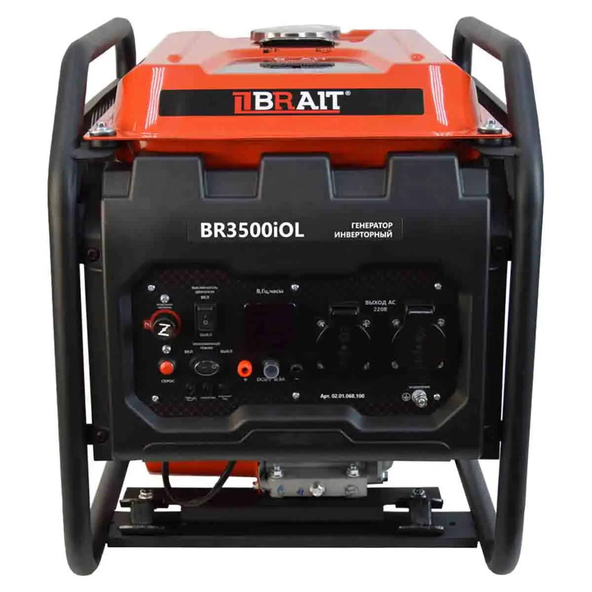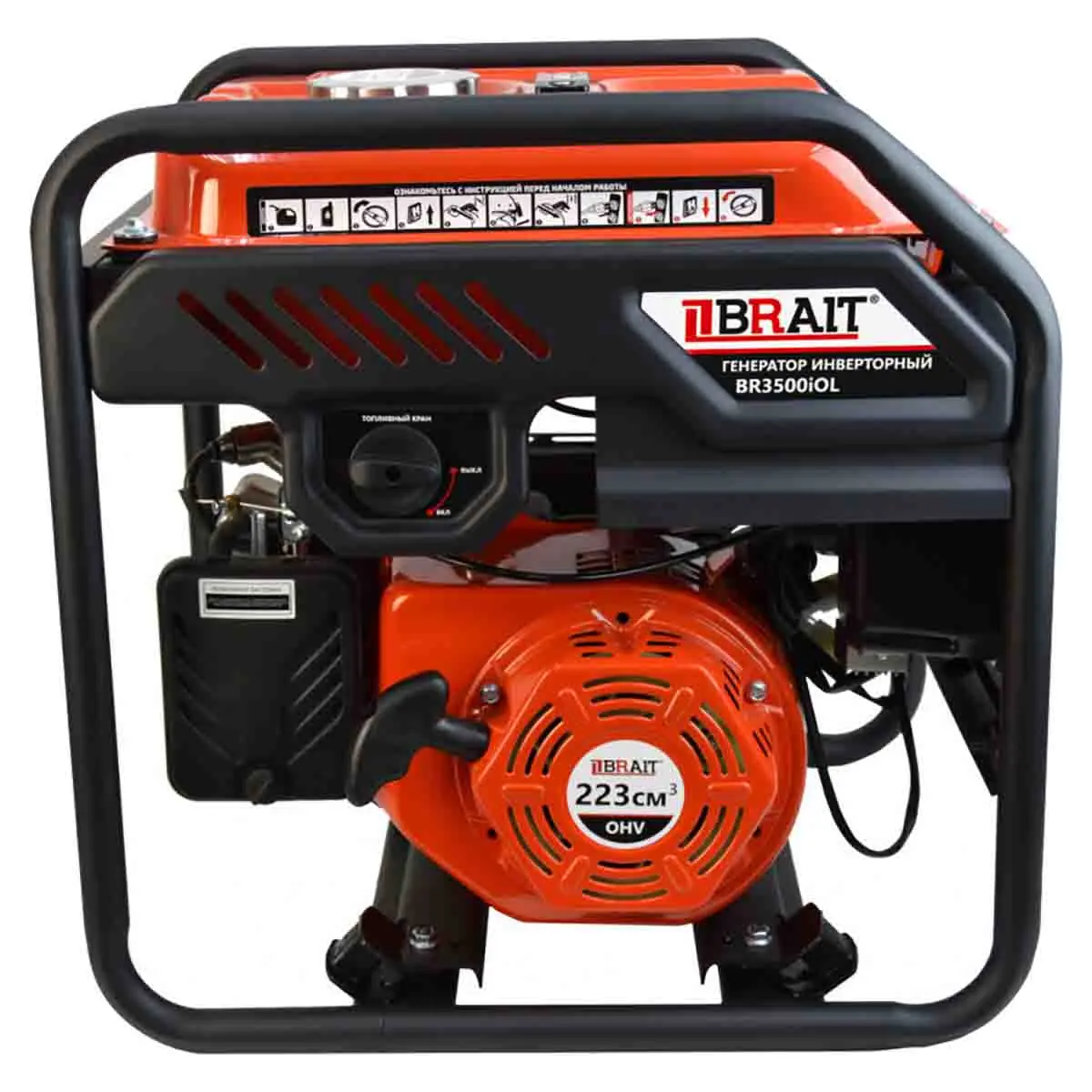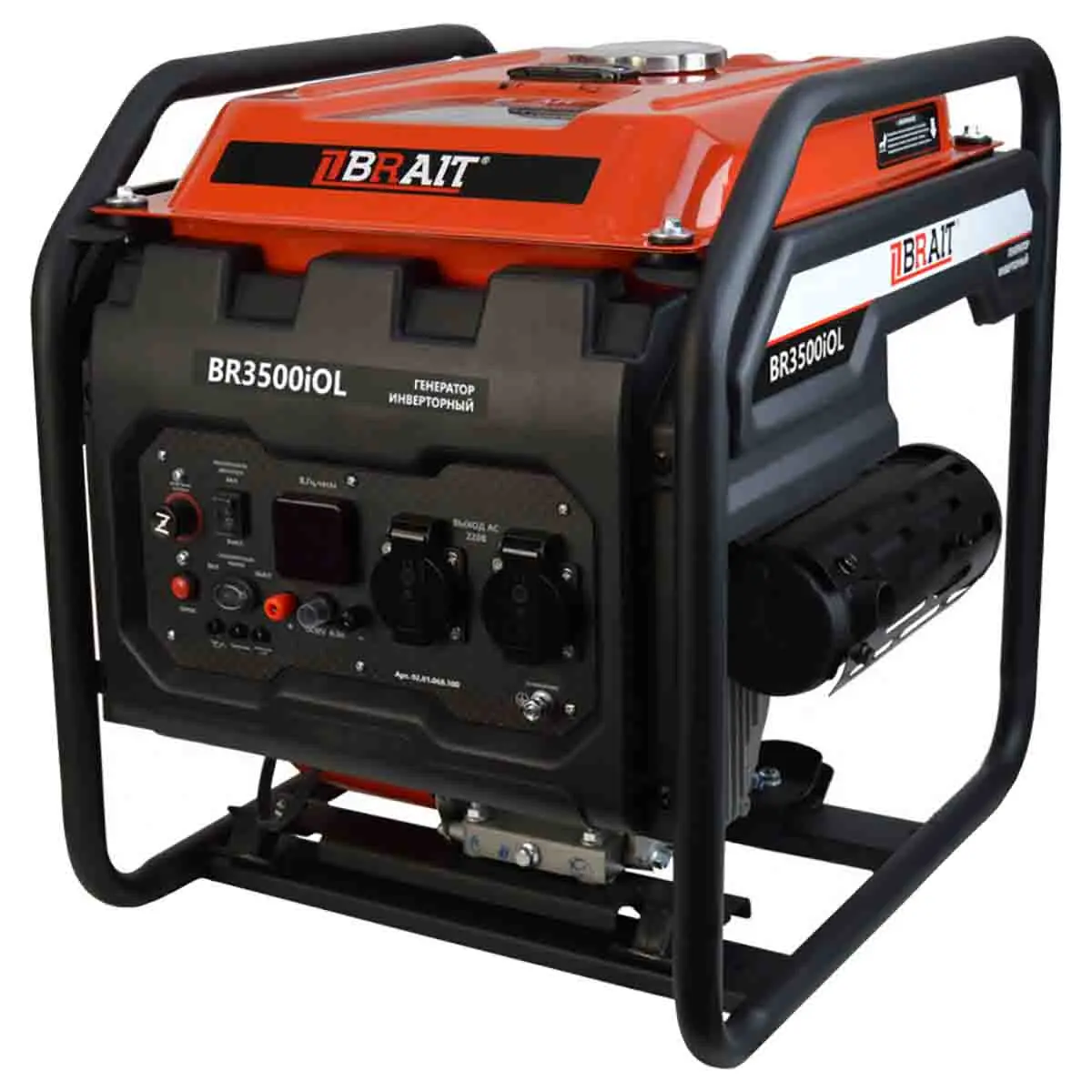 BRAIT BR-3500iOL работает за счет 4-тактного двигателя, который запускается с помощью ручного стартера. Объем бака для топлива – 12 л, что позволяет эксплуатировать технику на протяжении 3,8 часов без дозаправки. Номинальная мощность агрегата – 2,8 кВт, которой достаточно для подключения стандартной бытовой техники или электроинструмента.