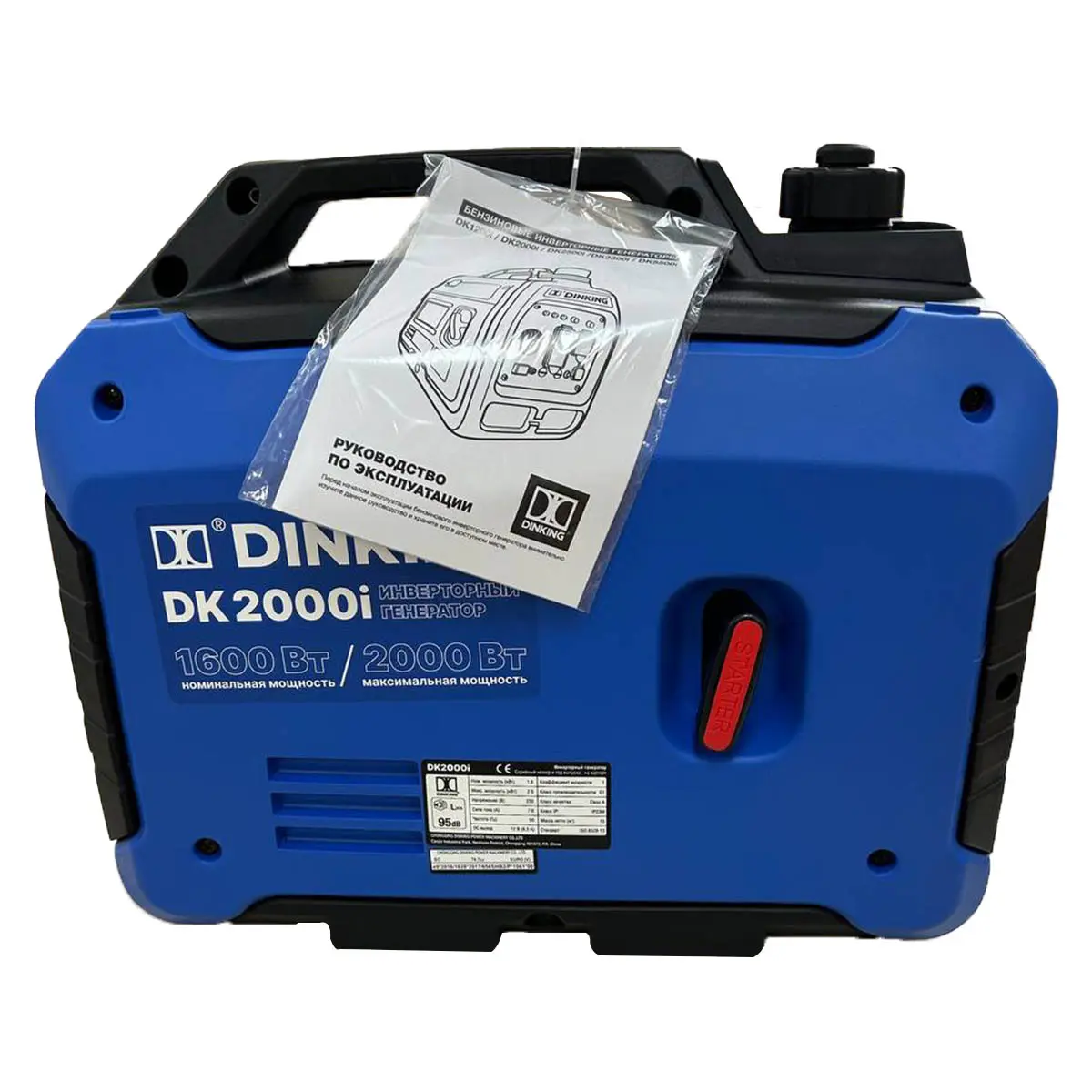 В модели установлен 4-тактный двигатель DK148F/P-3 с воздушной системой охлаждения. Автозапуск ручной. Номинальная мощность Dinking DK2000i составляет 1,6 кВт, максимальная – 2.0 кВт. Есть датчик масла в картере, который отключает генератор при его недостаточном количестве или не запустит при включении. Также установлен глушитель, снижающий шум во время работы. Синхронный альтернатор с обмоткой из меди передает "чистый" ток, что позволяет подключать приборы, чувствительные к напряжению.