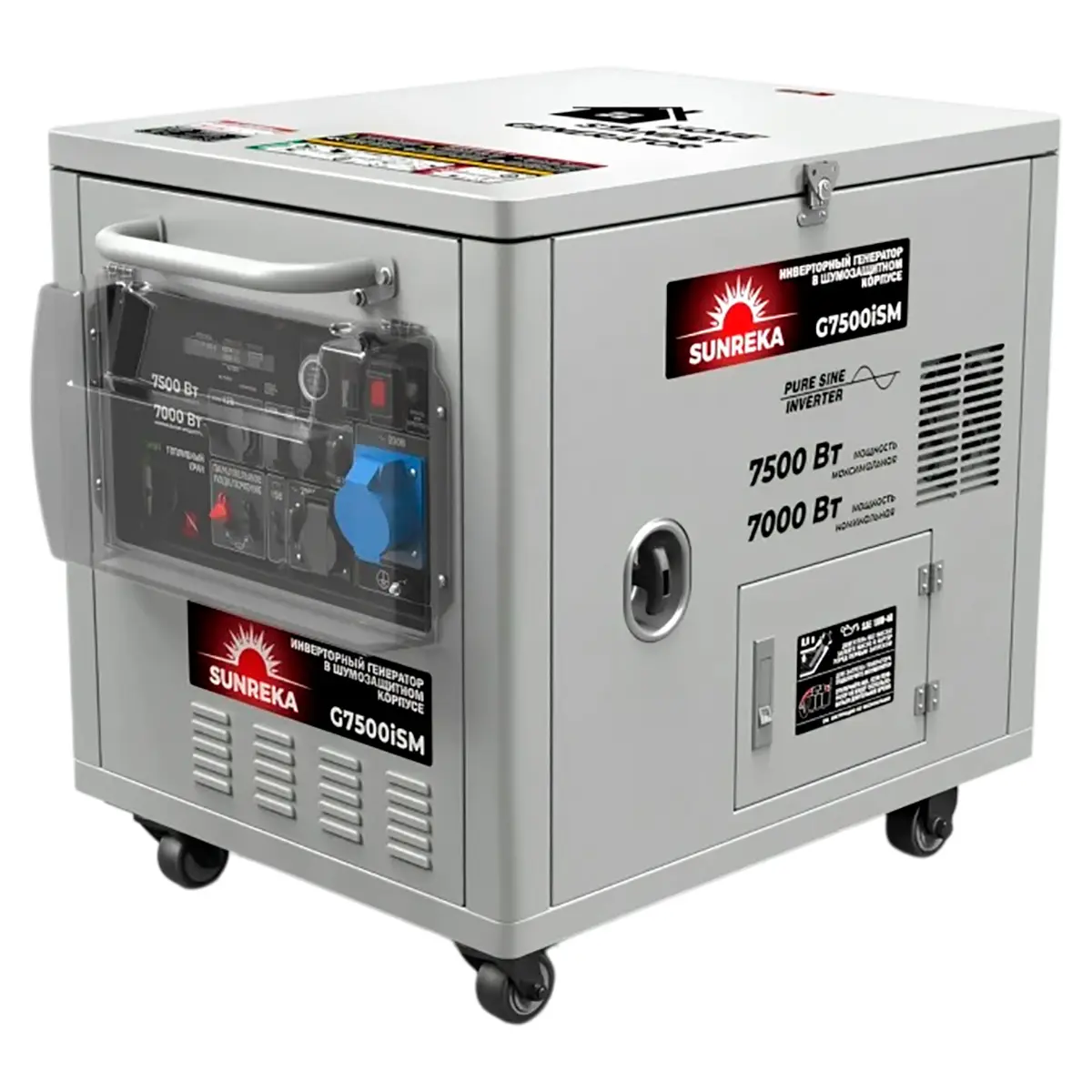 Стальной корпус с шумоизоляцией генератора G7500iSM обеспечивает сохранность основных узлов и низкий уровень шума во время работы: не более 68 дБ(А) на расстоянии 7 метров. Для заливки топлива и технического обслуживания оборудования имеются специальные крышки корпуса, на замках. Таким образом, мы имеем защищенный от внешних грубых воздействий (падение инструмента, камней, веток и др.) генератор, но при этом, его удобно обслуживать. Несмотря на то, что масса G7500iSM составляет ощутимые 94 кг, на данный момент это один из самых легких и компактных тихих генераторов номинальной мощностью 7 кВт в прочном стальном корпусе.