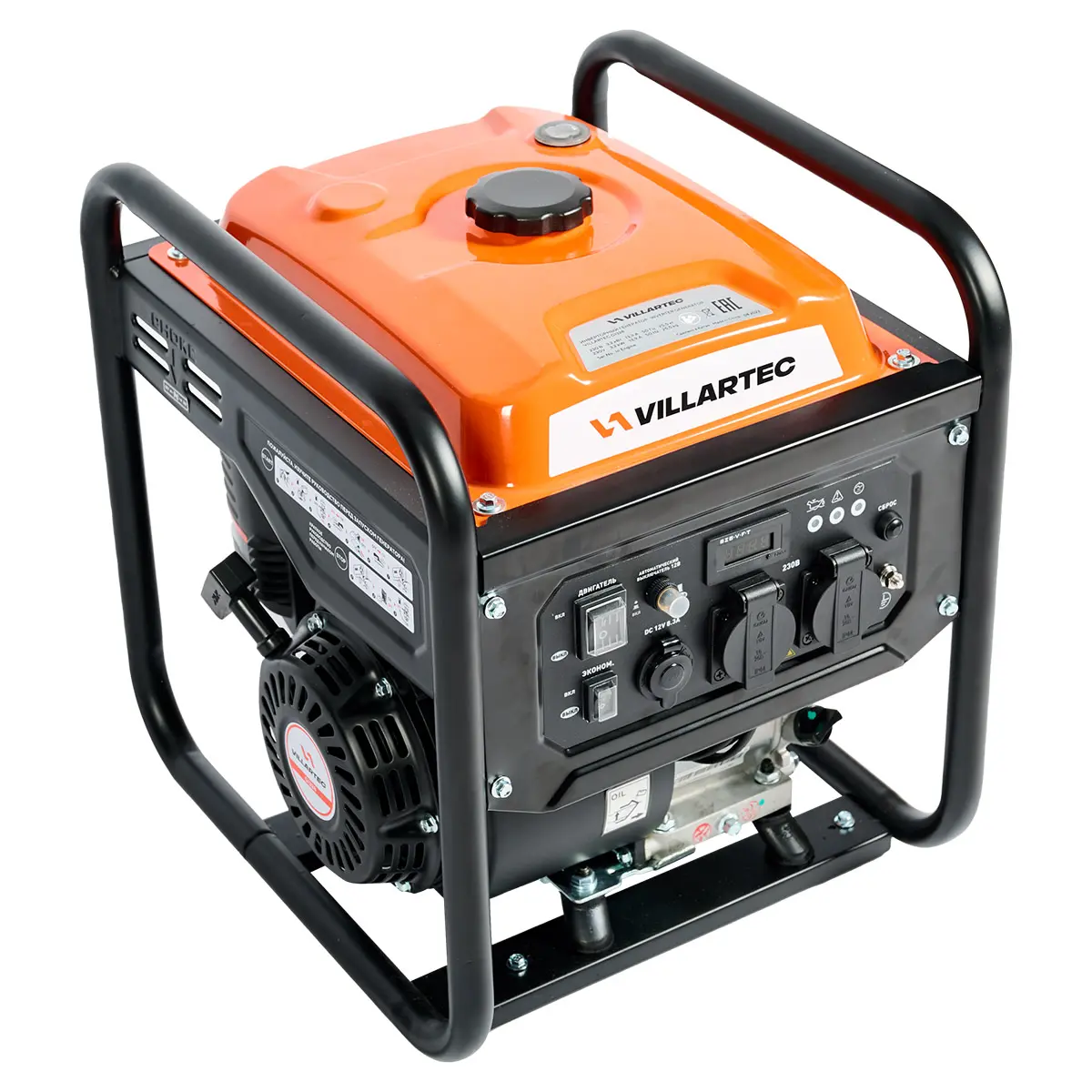 Модель VILLARTEC GI 328 оснащена дисплеем, на котором можно увидеть напряжение, частоту тока и наработку в моточасах. Это очень удобно для контроля выходных параметров и своевременного техобслуживания. Также имеются три светодиодных индикатора разных цветов, которые оповещают о перегрузке и недостатке масла.
