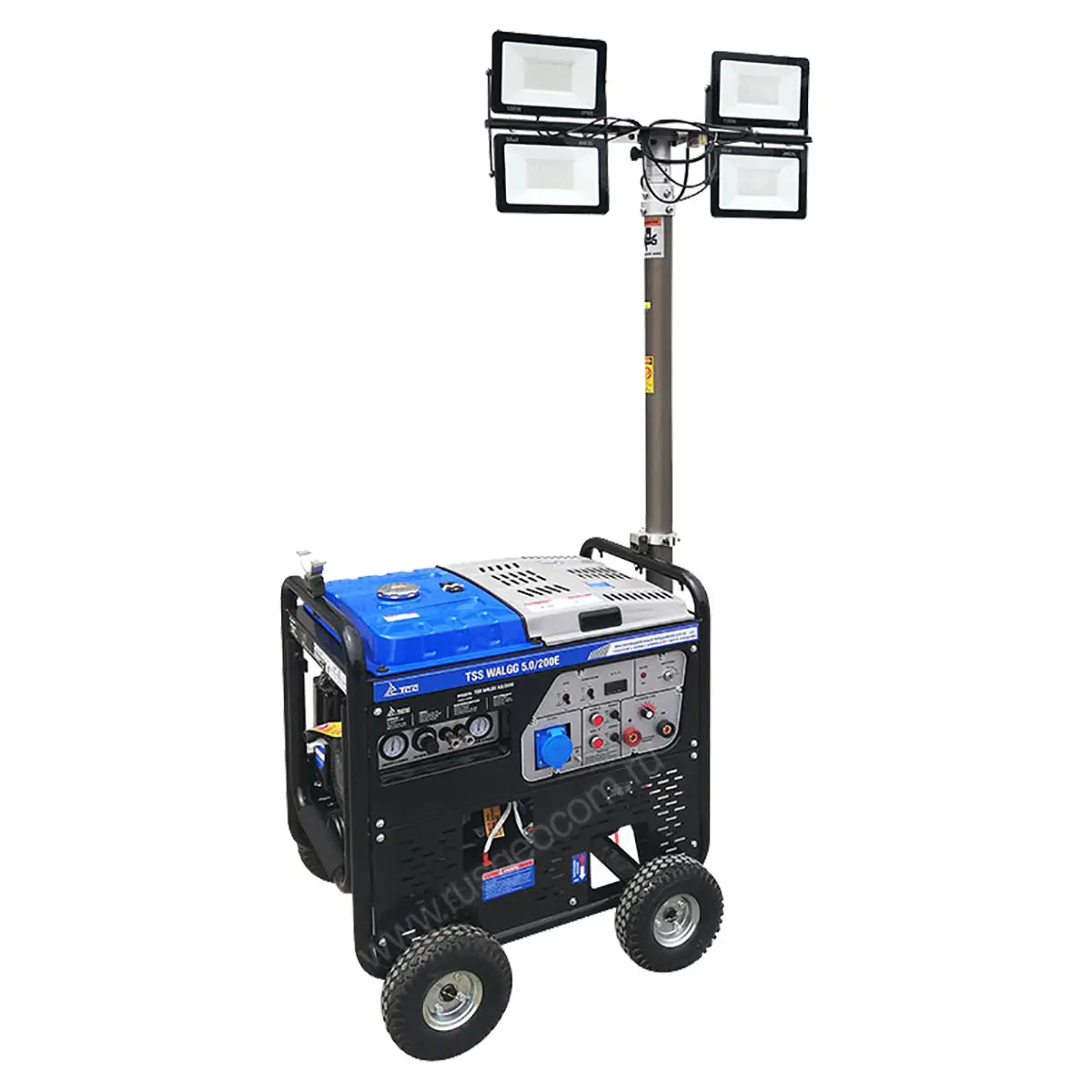 В отличие от схожего по характеристикам сварочного генератора модели WAGG 5.0/200E, эта модификация дополнительно оснащается комплектом светодиодных прожекторов на выдвижной штанге длиной 4,5 м, что дает возможность выполнять работы в любое время суток без дополнительных источников света.