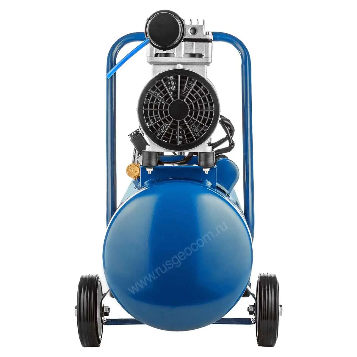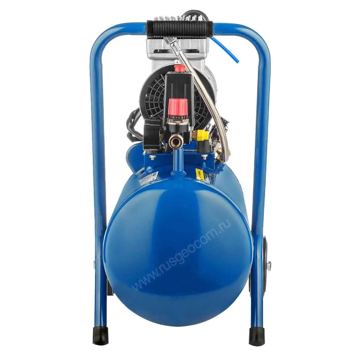 - Колесный комплект с транспортировочной ручкой дает возможность без особых усилий перемещать безмасляный компрессор по рабочей площадке.