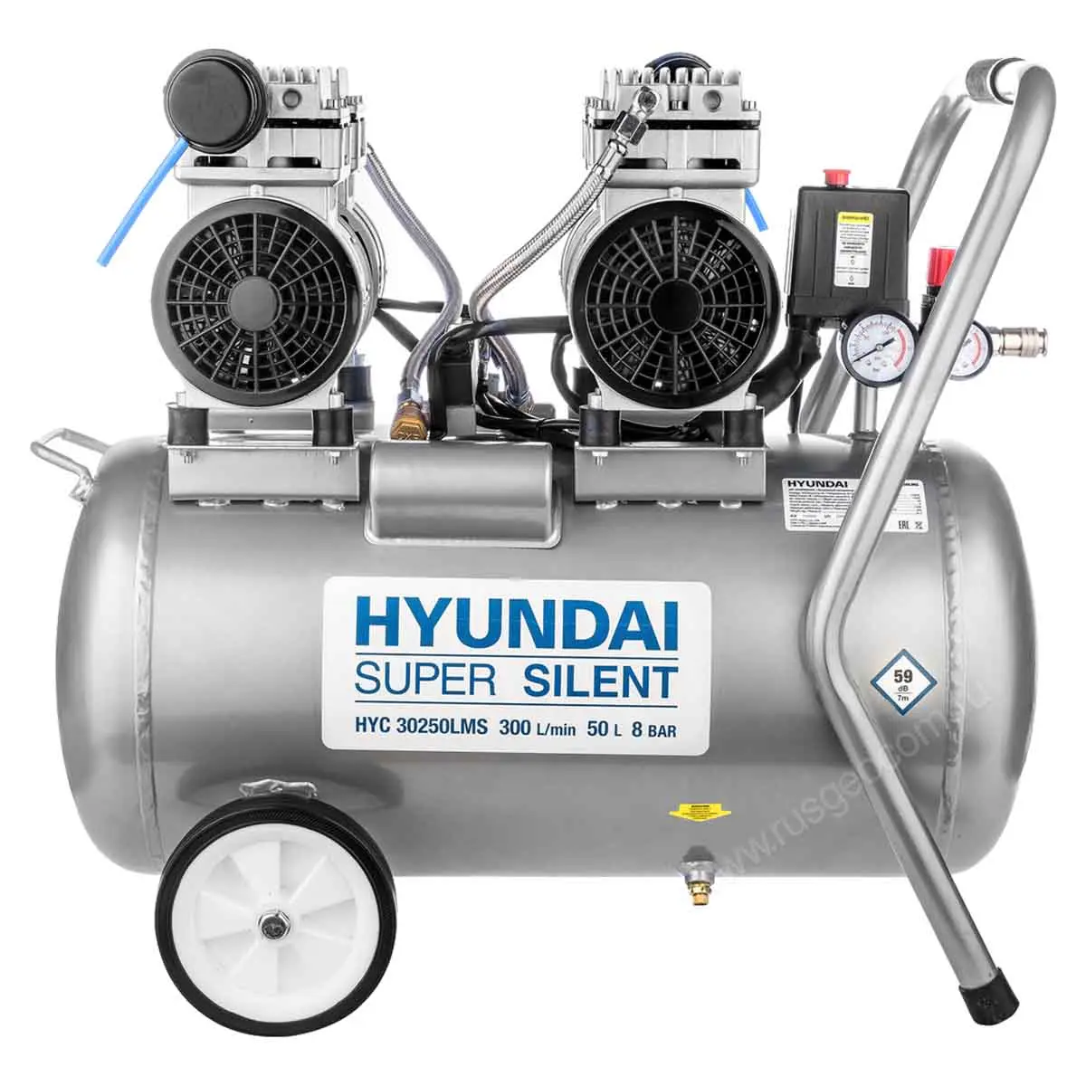Приводы с уменьшенной скоростью вращения обеспечивает пониженный уровень шума при работе Hyundai HYC 30250LMS. За счет специальной конструкции, фильтры с воздухозаборной трубкой выполняют роль дополнительных глушителей. С целью уменьшения вибраций для крепления насосных блоков к корпусу ресивера используются эластичные демпферы, а вместо жесткой трубки устанавливается гибкий воздуховод.